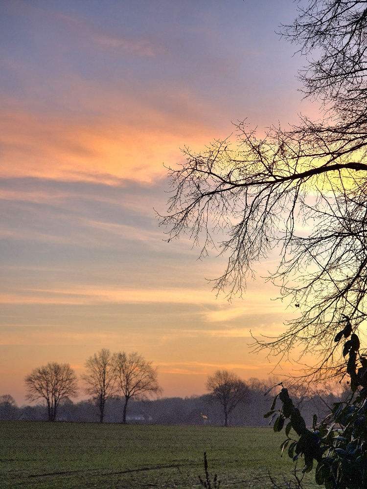 Heute morgen sah ich kurz vorm Sonnenaufgang zwischen allen Gelb-, Rosa- und Rottönen auch eine Partie Grünes (oben rechts im Bild) ... ist das nun noch Polarlicht, oder gehört das schon zum Sonnenaufgang?