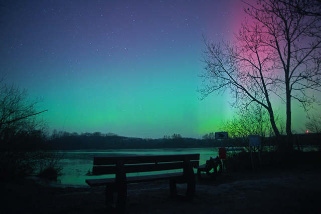 Danach war der grüne Bogen zwar noch gut visuell sichtbar, da sich dann jedoch nichts mehr tat, die Feuchtigkeit zunahm, Kamera und Stativ zunehmend von Reif überzogen wurden und ich durchgefroren war, habe ich die Beobachtung gegen 22:00 Uhr am See abgebrochen und nach einer Aufwärm-Pause noch von zu Hause vom Fenster aus in unregelmäßigen Abständen weiter beobachtet. Der grüne Bogen war zunächst noch vergleichsweise hoch und visuell als hellgraue Aufhellung sichtbar, fiel dann aber bis zum Beobachtungsende gegen 22:50 Uhr immer mehr zusammen .