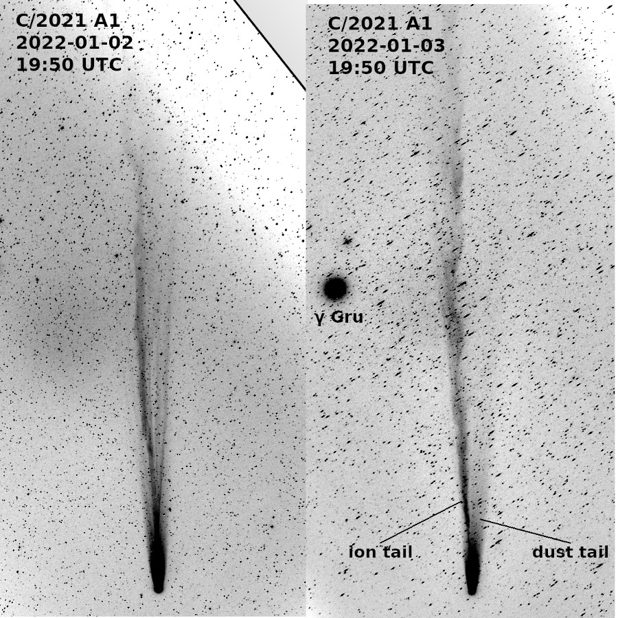Komet Leonard wird zwar schwächer (gestern vll. noch 5,1mag, indirekt noch mit bloßem Auge sichtbar), aber die Dynamik im Schweif um das Perihel ist hochinteressant. Hier ein Vergleich vom 2. auf den 3. Januar. Die Veränderungen innerhalb von 24h sind deutlich. Interessant auch, dass am 3.1. Ionen- und Staubschweif deutlich getrennt sind. Die verzerrten Sterne am 3. Januar sind durch den Wind geschuldet.