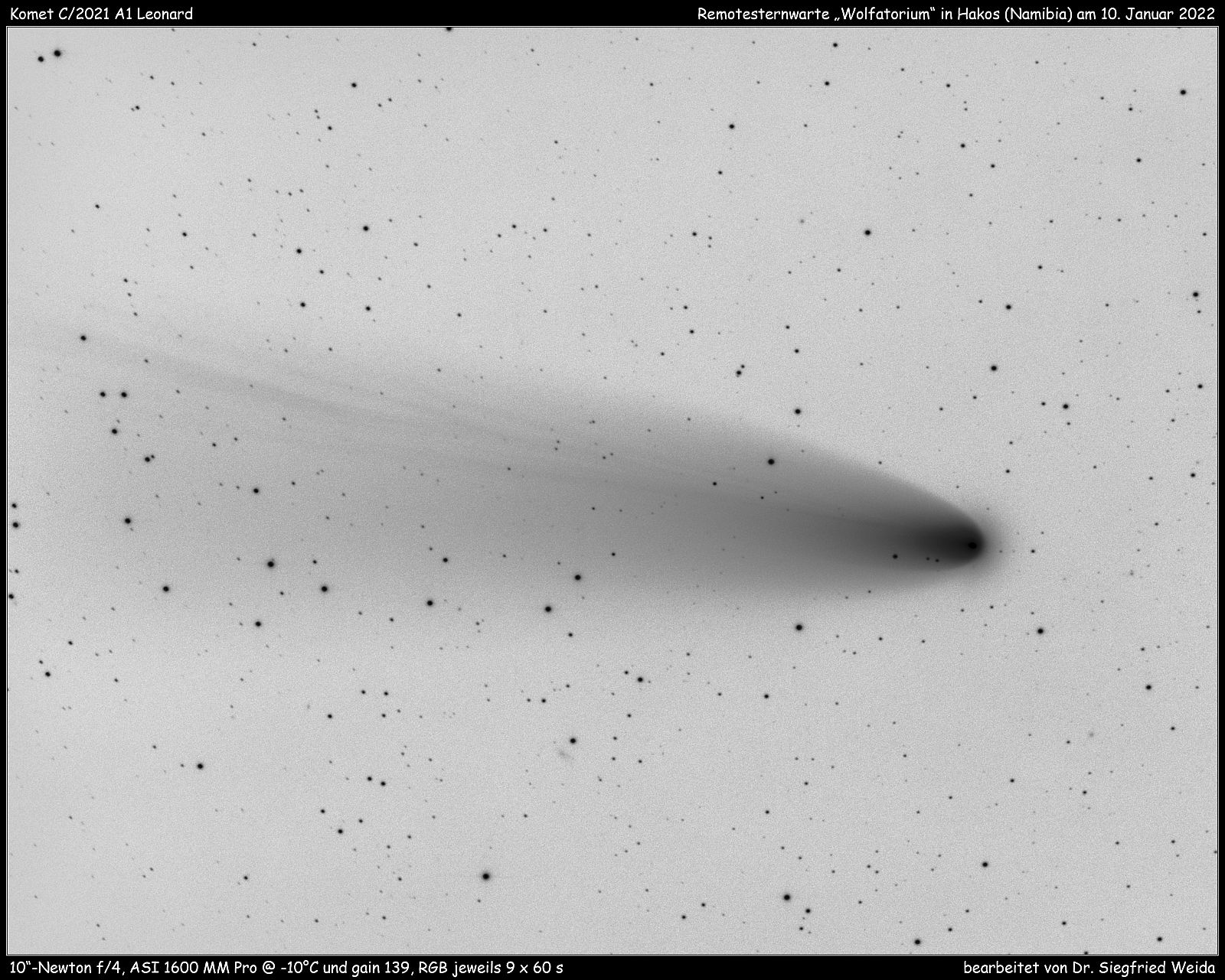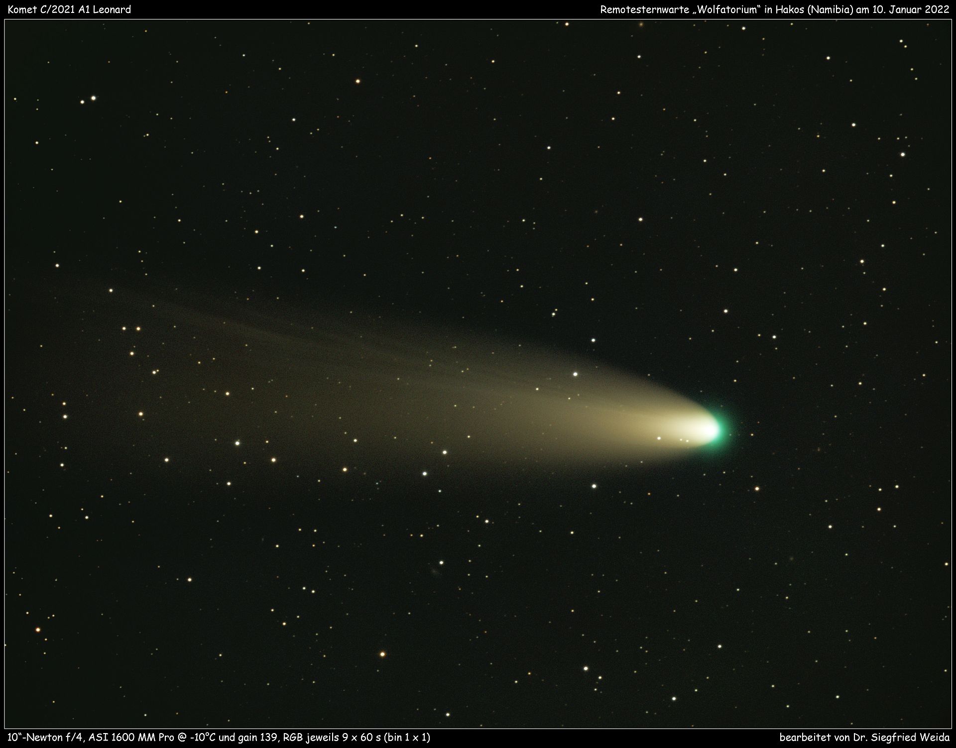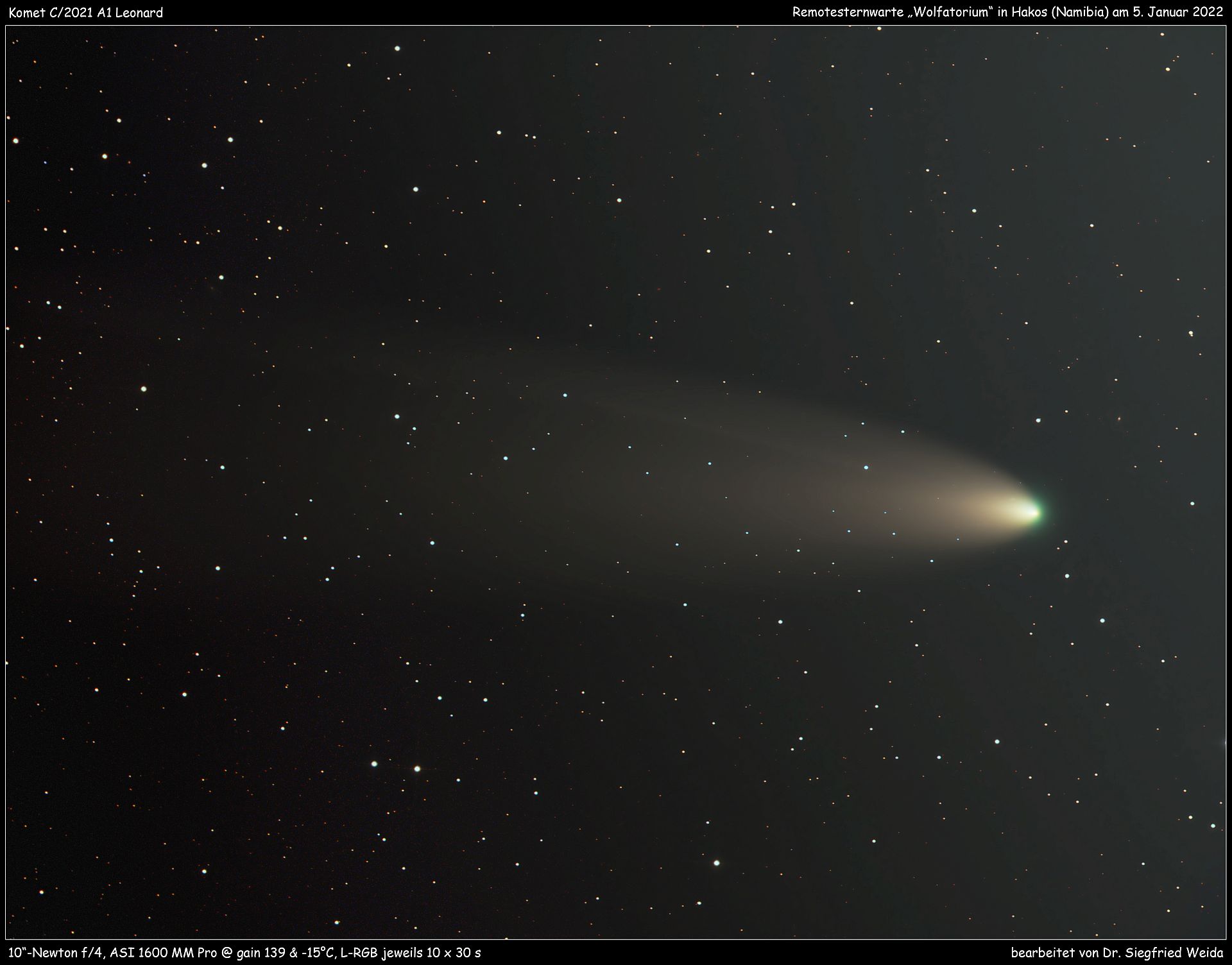 nun hat am 05.01. abends steve bemmerl leonard noch mal remote, auch von hakos aus aber mit dem "wolfatorium" 10" f4 aufgenommen, RGB 10x30S. sigi weida hats ausgearbeitet, obwohl noch reste einer polfehlausrichtung und dekollimierung zu erkennen sind - das ist die letzten beiden tage noch beseitigt worden