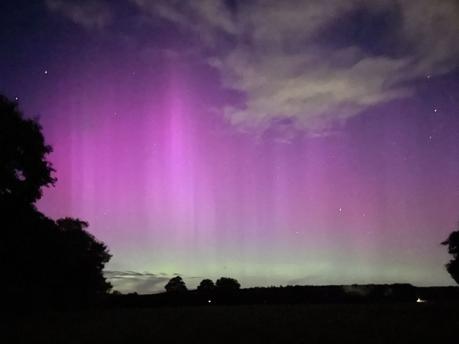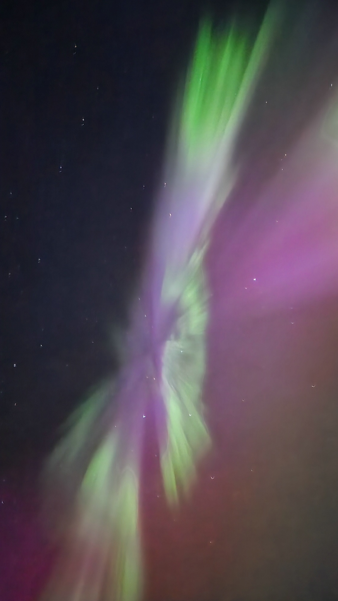 Habe aber den ersten Zeitpunkt verpasst, weil ich bis 20h im Baumarkt war, dann das Fahrrad beladen habe und zu Fuß zu einem weiteren Geschäft geschoben habe. Von dort bin ich dann ca. 22 Uhr wieder zu Fuß Richtung Wohnung gelaufen. Als freier Blick nach Norden war, habe ich durch die Handykamera geschaut, weil graue Streifen am Himmel zu sehen waren, sahen aber wie dünne Wolkenstreifen aus. Es wurde beim Blick aufs Display auch nicht farblich, denn ich hatte um ca. 18h auf dem PC gesehen, dass es abends evtl. Polarlicht geben könnte, aber ob bis GÖ?