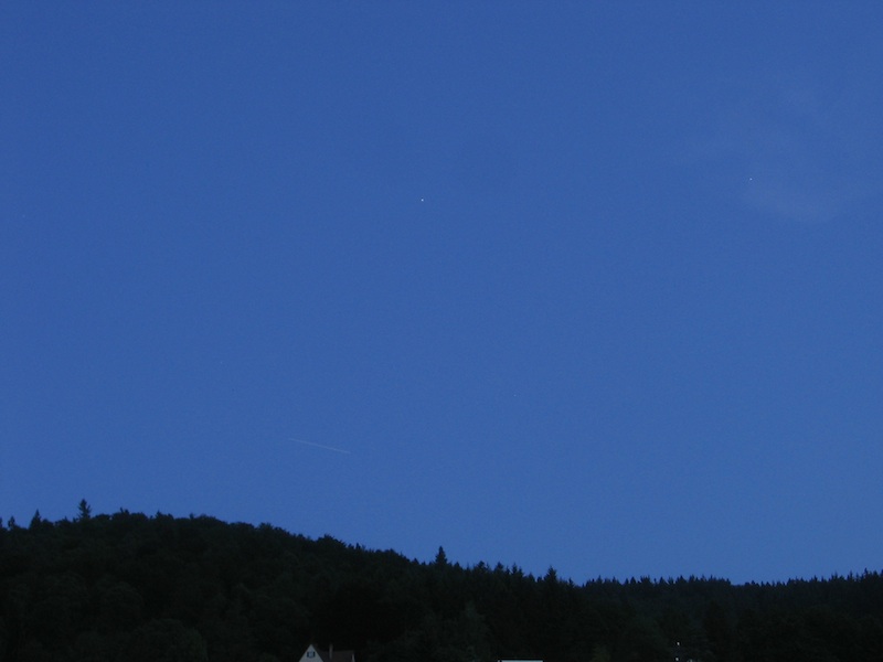 Abb. 1: 1. Überflug der ISS um 22:13 MESZ; Helligkeit ca. -1.7 mag, Sonnendepression 4.8°. Belichtungszeit 0.5s bei Blende 3.6, ISO 100 und 126mm Brennweite (Kleinbild-Äquivalent).