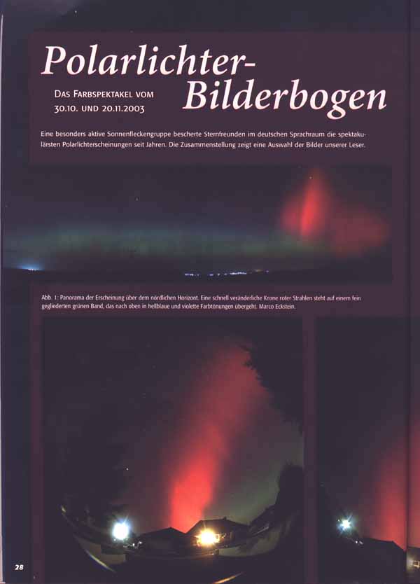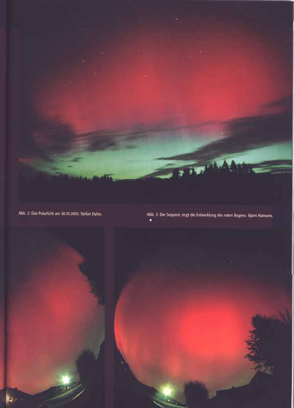 Am schönsten ist die Titelseite gelungen. Im Innenteil findet man 4 Seiten mit jeweils drei Fotos, die sich jedoch zum Teil recht ähnlich sind. Gelungen sind meines Erachtens besonders die Panoramafotos, die sehr schön kompletten den „Polarlichtbogen“ von Ost bis West zeigen. Und ein Bild einer Korona sieht man ja auch nicht so häufig. Hier im Forum haben wir jedoch sicherlich auch schon manch besseres Foto gesehen.