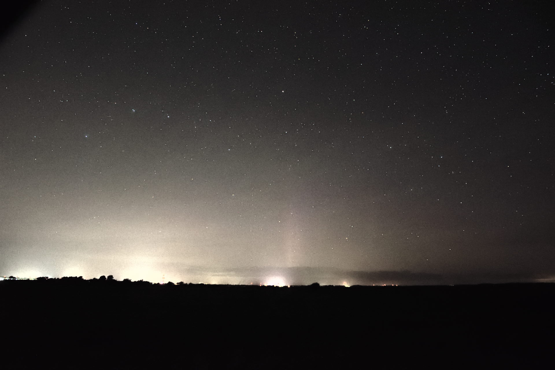 War zunächst von 20:30 UTC-22:00 UTC draußen. Außer sehr bescheidenem fotographischem PL war nichts..."Belegfoto" mit fotographischem PL, etwas Airglow und einem Meteor hänge ich 'mal 'dran.
