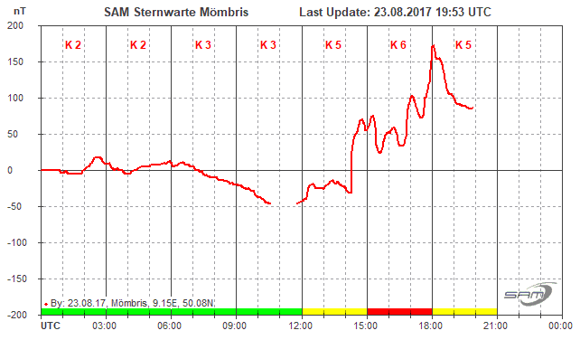 Ich schaue zur Kontrolle auf SAM Scheggerott und MAG Kiruna. Auf beiden ist zur der Zeit ebenfalls auf der X-Achse Aktivität, wenn auch unterschiedliche Dynamik (Scheggerott ca. -75 nT auf +25 nT ; Kiruna ca. 10725 nT auf 10225 nT).