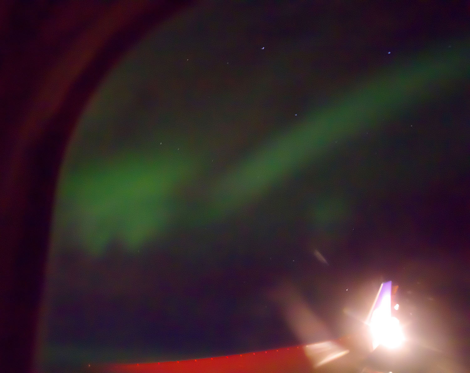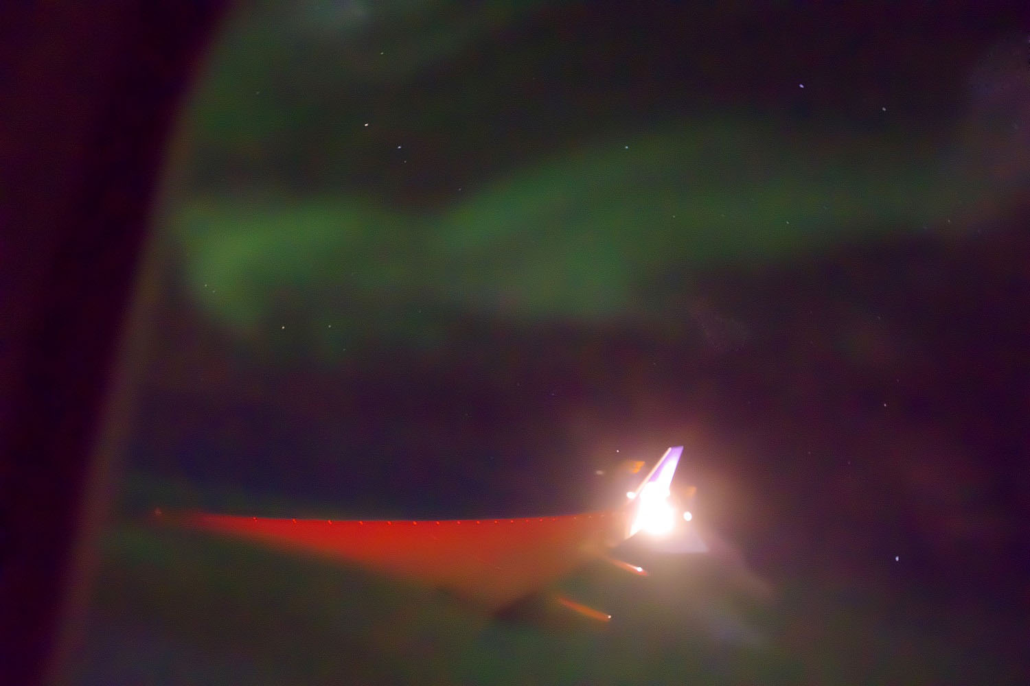 Zwischen Grönland und Neufundland kurz vor Mitternacht Ortszeit zog ich mir dann die Decke über den Kopf, um das Kabinenlicht auszublenden, und schaute aus dem Fenster Richtung Südwesten. Wow, da war was im Gange, der ganze Himmel leuchtete wie ein intensiver weißer Nebel und das Bild änderte sich im Sekundentakt, so ein schnelles Polarlicht habe ich noch nie gesehen (und überhaupt noch nie so intensives Polarlicht aus dem Flugzeug). Flugs die Kamera auf ISO 25600 / 2s / Blende 3,5 gestellt und ans Fenster gehalten. Ein paar Bilder wurden leidlich scharf.