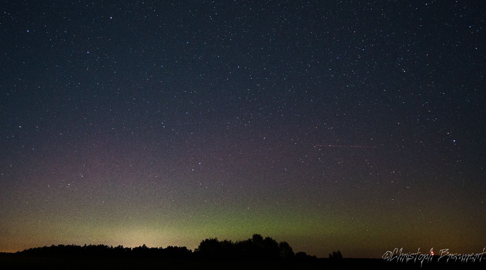 Ich konnte in der Zeit von 20 Uhr - ca. 20:30 Uhr fotografisches Polarlicht nachweisen. Ein wandernder grüner Bogen mit violetten Beamern darüber.