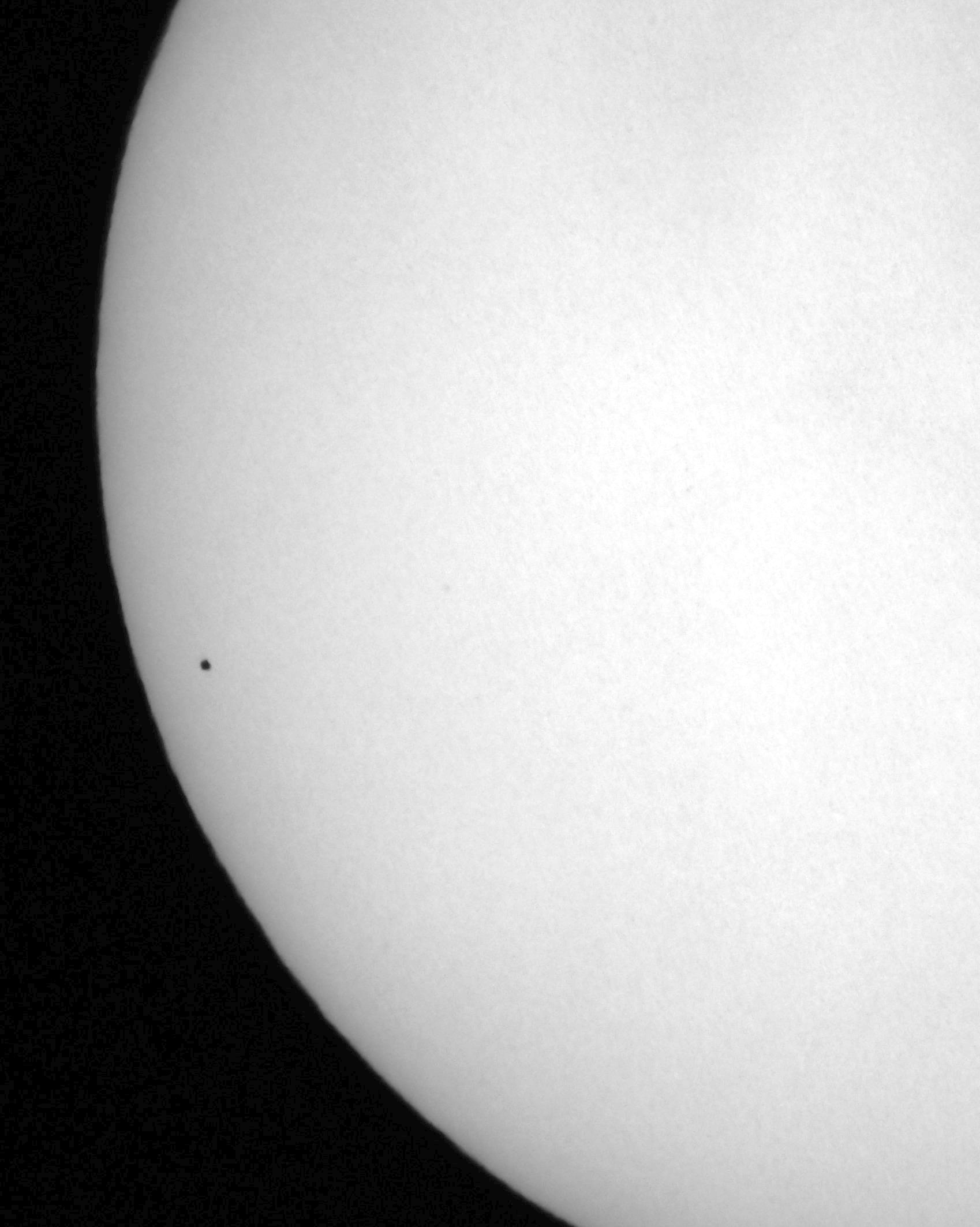 Bei strahlend blauem Himmel konnte der Merkurtransit hier beobachtet werden. Allerdings war das Seeing im Gegensatz zu gestern extrem schlecht, so daß der Sonnenrand aussieht wie die Mondoberfläche