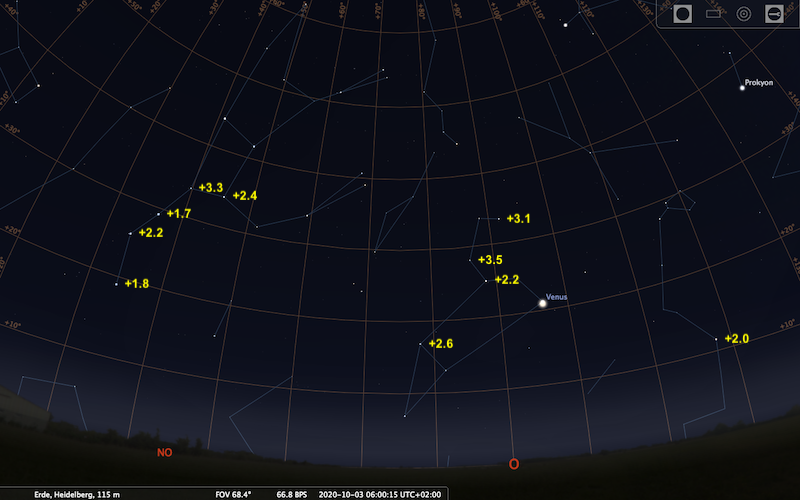 Günther Können hat im Februarheft von Meteoros einen Beobachtungsvorschlag zur Beobachtung von Regulus in der Morgendämmerung am 3.10.2020 veröffentlicht. Dabei geht es darum, mit Hilfe der Venus als Orientierungspunkt den dicht bei ihr stehenden Regulus (Abstand 0°20’) so lange wie möglich zu verfolgen (mit bloßem Auge und mit Fernglas) – reicht die Sichtbarkeit mit bloßem Auge bis zum Sonnenaufgang? Bei dieser Beobachtung kommt es darauf an, wie lange der Regulus zu sehen/erkennen ist und mit welchen Hilfsmitteln.