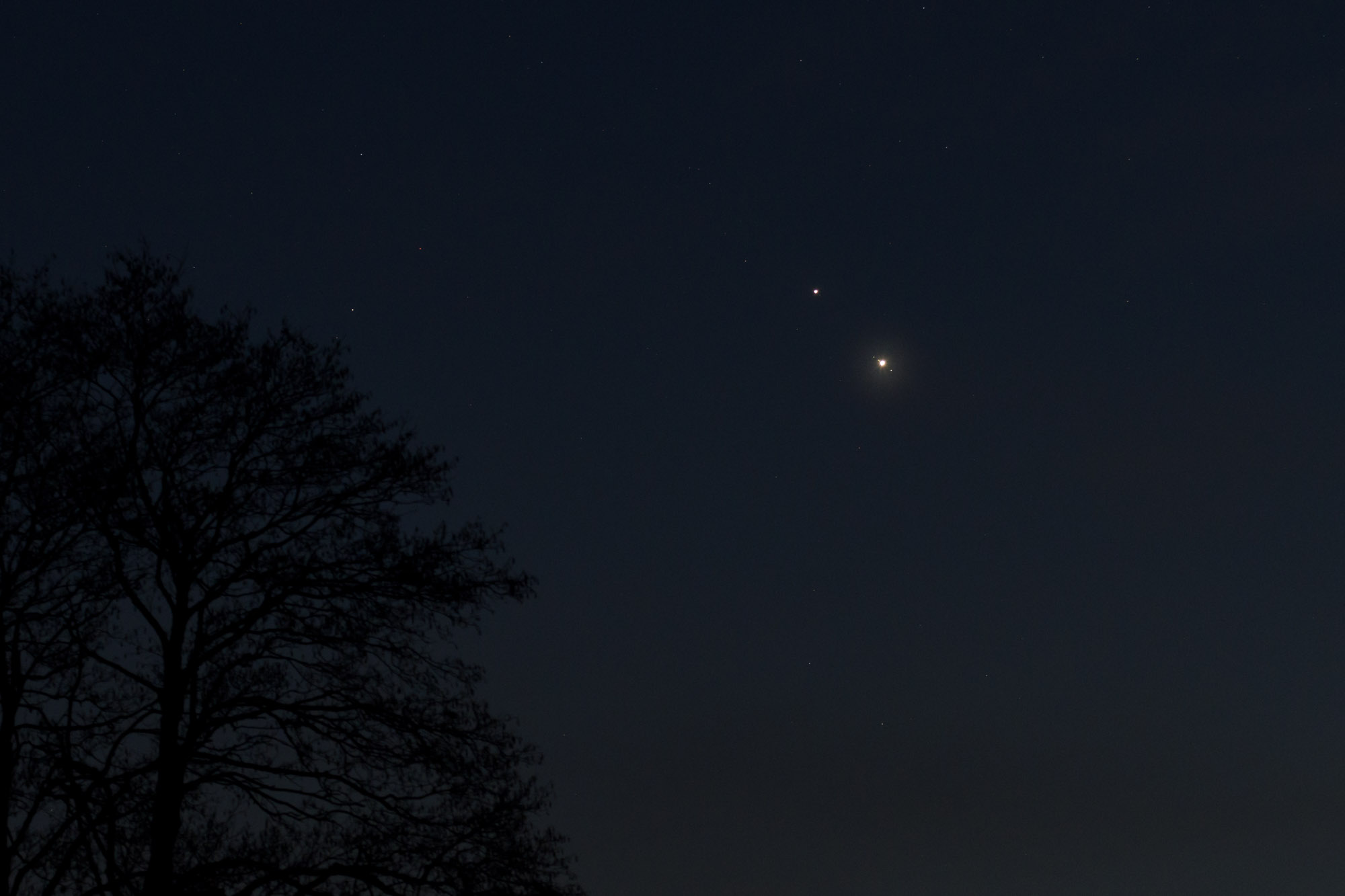 Heute hatte ich endlich die Möglichkeit, dass sich immer näher kommende Planetenpaar zu bewundern. Zunächst hatte ich Sorgen, dass sich die vorhandenen Wolken nicht rechtzeitig verziehen würden. Doch dann kämpfte sich bereits die schmale Mondsichel durch. Und kurze Zeit später waren dann auch Jupiter und Saturn wunderbar zu beobachten.