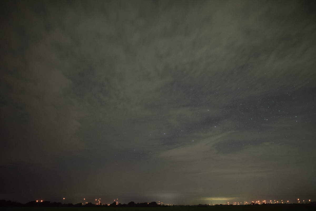 Zu dem peak gegen 22.45 UTC hatte ich die Kamera auf dem Dachfenster platziert. Je tiefer die MMs gingen, desto mehr zog aber Mister M. den Wolkenvorhang zu. Beim durchscrollen der Bilder stellte ich etwas fest, dass sich tief am Horizont langsam von Ost nach West bewegte. Die Wolken zogen streng von Süd nach Nord. Später in Lightroom war an besagter Stelle ein Baemer zu erahnen.