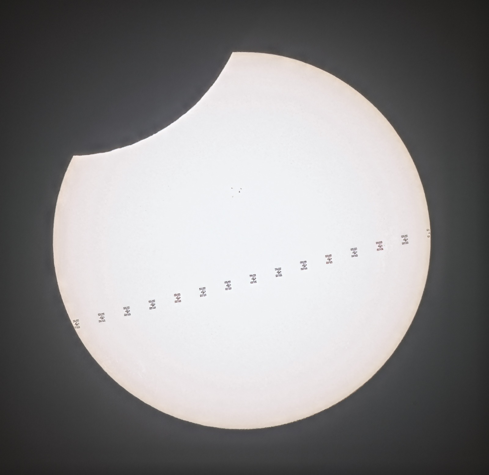 das problem bei der ISS liegt an der scharfstellung. das automatische aufsuchen und die nachführung mit dem kleinen SolarQuest, bestückt mit dem 90er ED ohne flattener, klappt eigentlich ganz gut. wenn allerdings der aufbau länger in der sonne steht muss man öfters nachfokussieren, was ich mir gespart hatte. drum ist auch der sonnenfleck nicht zu erkennen