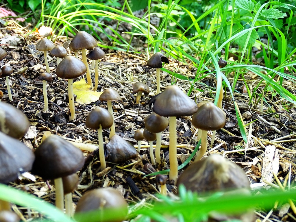 Als die Sonne um 12 Uhr immer noch hinter Wolken steckte, ist klar, dass ich einen anderen Standort suchen muss. Ich schnappe also Kamera, Fernglas, Filter und einen großen Becher Kaffee und fahre los. Richtung Süden, also vom Taunus weg, ist der Himmel klar. Der schnellste Weg in diese Richtung führt über die A661. Überraschenderweise kommt die Sonne erst hinter dem Bad Homburger Kreuz zum Vorschein. Durch das offene Dachfenster und eine dünne Wolke erhasche ich einen ersten Blick auf die Finsternis. Ich beschließe, noch weiter zu fahren, um Abstand zu dem sich offenbar weiter ausdehnenden Gewölk zu finden. Von der A661 geht es über die B3 in die Wetterau. Ich denke derweil über ein ruhiges Plätzchen zur Beobachtung nach und entscheide mich schließlich für das Umfeld des Sportplatzes am Ortsrand von Karben-Kloppenheim. Hier kann ich das Auto im Schatten abstellen und 5 Meter entfernt zwischen 2 Bäumen (Abb. 1) die Sonne ins Visier nehmen. Filter auf die Kamera und schon geht es los. Die ersten "Sicherheitsfotos" gefallen mir nicht - offenbar ist das Objektiv schmierig. Nach einer Reinigung stimmt die Qualität dann. Nachdem ich mir die Sonne auch mit SoFi-Brille und Fernglas angeschaut habe, fällt mir eine Gruppe ganz hübscher Pilze (Abb. 2) neben dem Parkplatz auf. Schließlich folgen noch einmal ein paar Sonnenbilder; aus dieser Serie stammt Abb. 3.