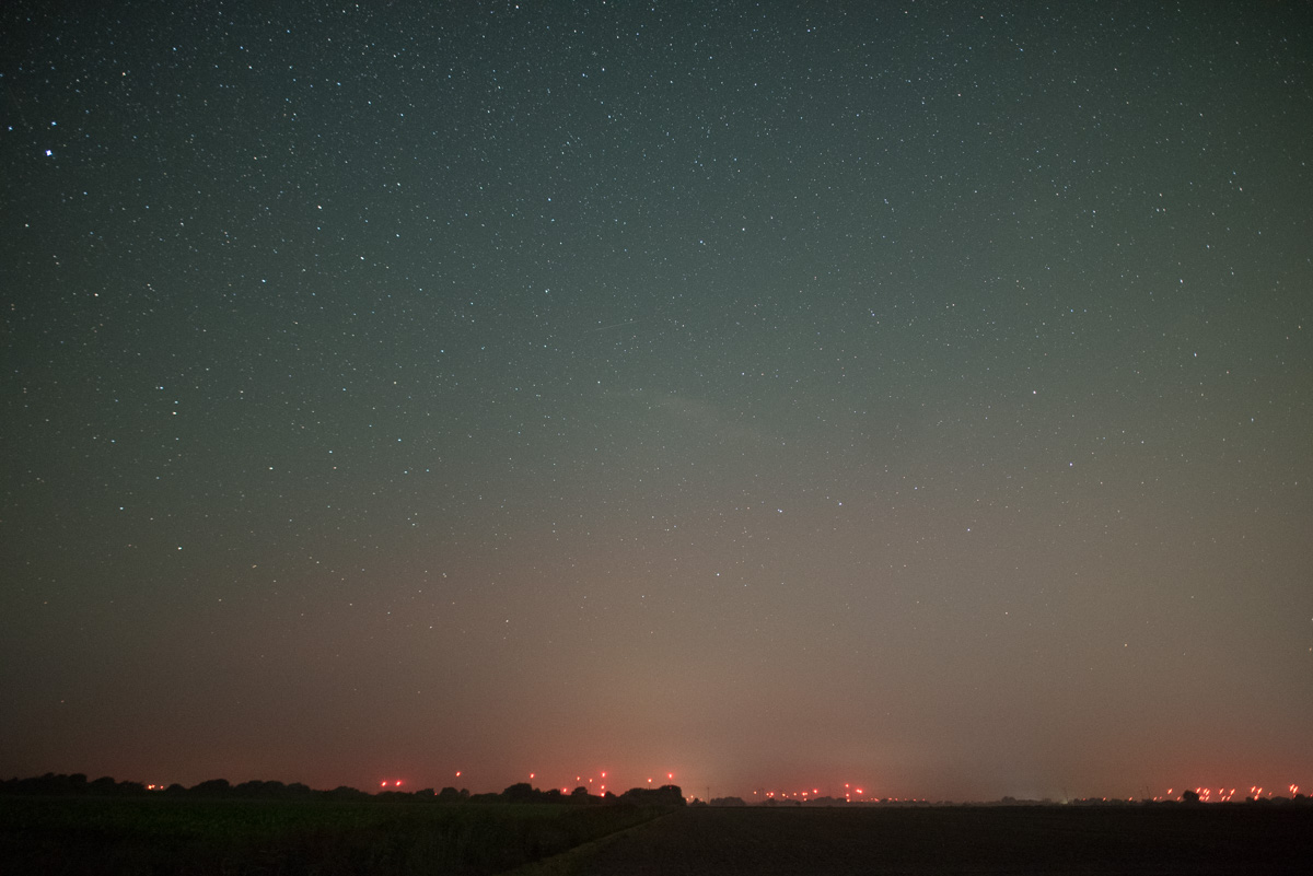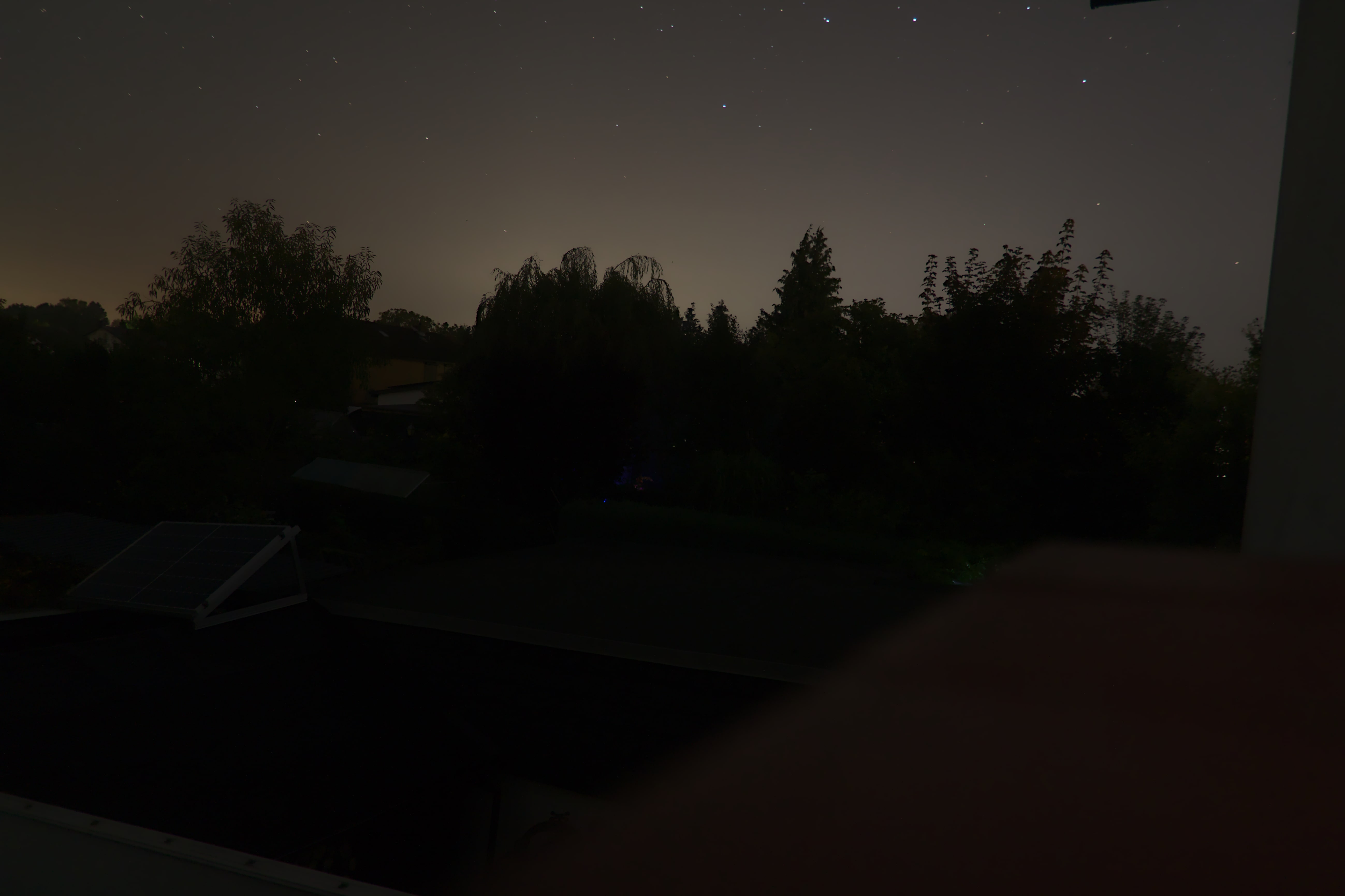 Ich hatte mir ein Zeitlimit bis 00:00 UTC gesetzt. 20 Minuten vorher besserten sich die Bedingungen (im Süden frei von Wolken und Dunst, Zenit bis in den Norden Altocumulus übergehend in ein Gemenge von horizontnahen Dunst und Wolken) und ich habe die Kamera gestartet.