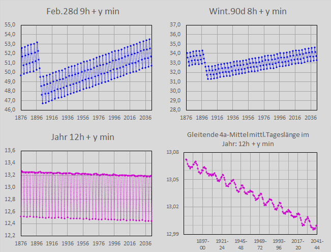 Das Schaltjahr schiebt die Monate dann wieder 1° in Richtung Winter zurück. Die mittleren Tageslängen fallen wieder runter.