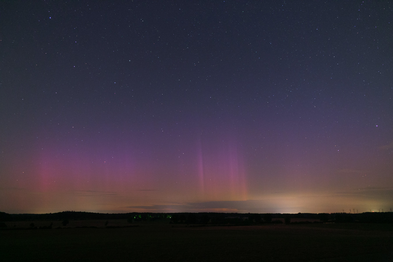 das war ja ein schönes Polarlichtereignis. Ich war wegen der Bewölkung nördlich von Hamburg nach Osten ausgewichen und stand in der Nähe von Talkau. Nachteil ist dort die Lichtglocke von Lübeck ziemlich genau im Norden. Immerhin war es dort anfangs noch schön klar. Das änderte sich aber später in der Nacht. Auffällig während der Substürme waren die immer wieder auftretenden hochreichenden, blauen Strahlen. Zudem gab es einigen Airglow.