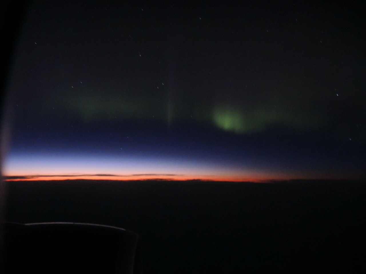 ich war letzte Nacht mit dem Flieger von Toronto nach Frankfurt unterwegs. Als die Maschine etwa 500km südlich von Grönland gegen 3:30 MESZ unterwegs war, konnte man die Polarlichter deutlich sehen. Mit schönen grünen und violetten Beamern. Nach etwa einer halben Stunde war nur noch ein grüner Bogen sichtbar, der bis zur Morgendämmerung erkennbar blieb.