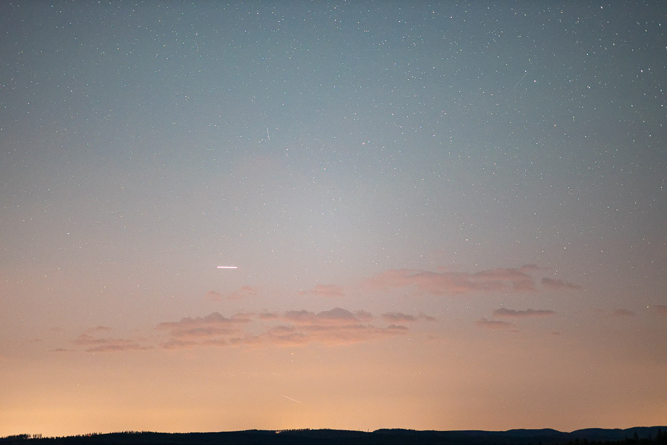 Hab das "Ding" genau zu der Zeit auch im Zeitrafferfilm. Kommt ziemlich genau Nord über den Horizont und fliegt etwa Richtung Südwest wie auf dem Amrum Bild. Es ist auf 7 Einzelbildern mit je 20" Belichtungszeit, also 140" = 2 Minuten 20 Sekunden auf meinen Aufnahmen. Sieht eher wie ein Satellit oder Oberstufe aus. War sehr hell.