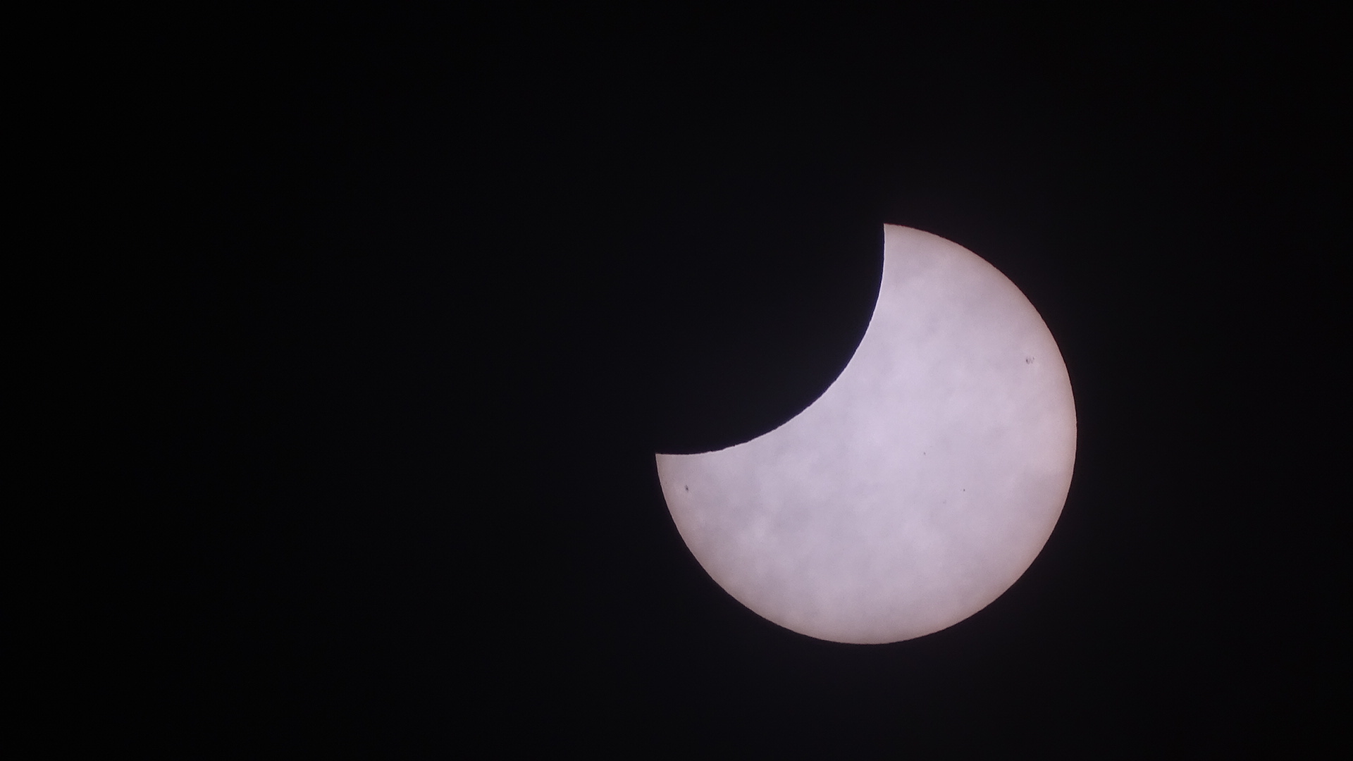 Wie an vielen anderen Orten war auch bei mir in Norddeutschland der Himmel lange komplett bedeckt. Erst kurz vor Maximum war die Sonne als undeutlicher Fleck durch die Wolken hindurch sichtbar. Erst kurz nach Maximum gelang dann die erste Sichtung und das erste Bild, wobei die Fokussierung wegen der weiterhin durchziehenden Wolken nicht gut war. Zum Ende hin waren nur noch dünne Schleier und Dunst über. Komplett klar war der Himmel nie.