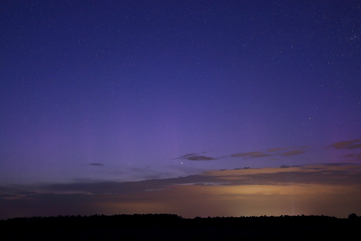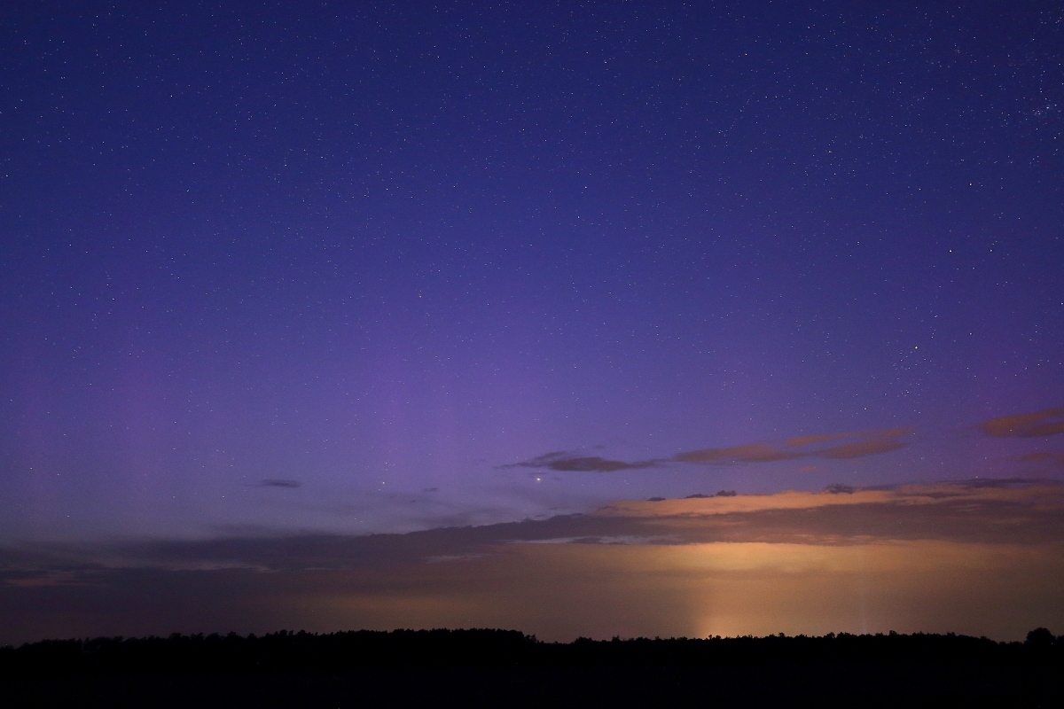 Hier nun 6 Frames des im Zeitraums von 00:29 - 00:49 MESZ auschließlich fotografisch gut nachweisbaren Polarlichts aus der Nähe von Schmerwitz im Hohen Fläming (52.14N, 12.46E). Der sich zügig nähernde troposphärische Wolkenteppich störte mich dabei deutlich weniger als die künstliche Lichtershow von mindestens 2 Strahlern unterschiedlichen Farbspektrums, die im N/NNO gegen 23 Uhr MESZ entfacht wurde und zu meinem Leidwesen bis einschließlich meines Aufbruchs in der frühen Morgendämmerung gegen 02:30 MESZ anhielt. So hatte ich mir das im Naturpark, zumal unter der Woche, eigentlich nicht vorgestellt. Aber da die hereinziehenden Wolken tief hingen, können die Strahler selbstverständlich auch außerhalb des Naturparks stationiert gewesen sein. Wie dem auch sei, das ist eine Form an nicht nur der Natur, dem Menschen, und dabei natürlich auch uns Himmelsbeobachtern massiv schadenden Energieverschwendung, die meines Erachtens verboten, oder zumindest reguliert gehört. Mit Blick auf ein wunderschönes Sternenmeer in den zenitnahen Bereichen des Firmaments um die astronomische Mitternacht herum konnte ich meine Frustration aber schnell bändigen. Und die Lichtverschmutzung lässt sich zumindest per Nachbearbeitung im HSL-Bereich auf ein noch gerade so ertägliches Maß regulieren, zumindest was das orange-rote Farbspektrum angeht.