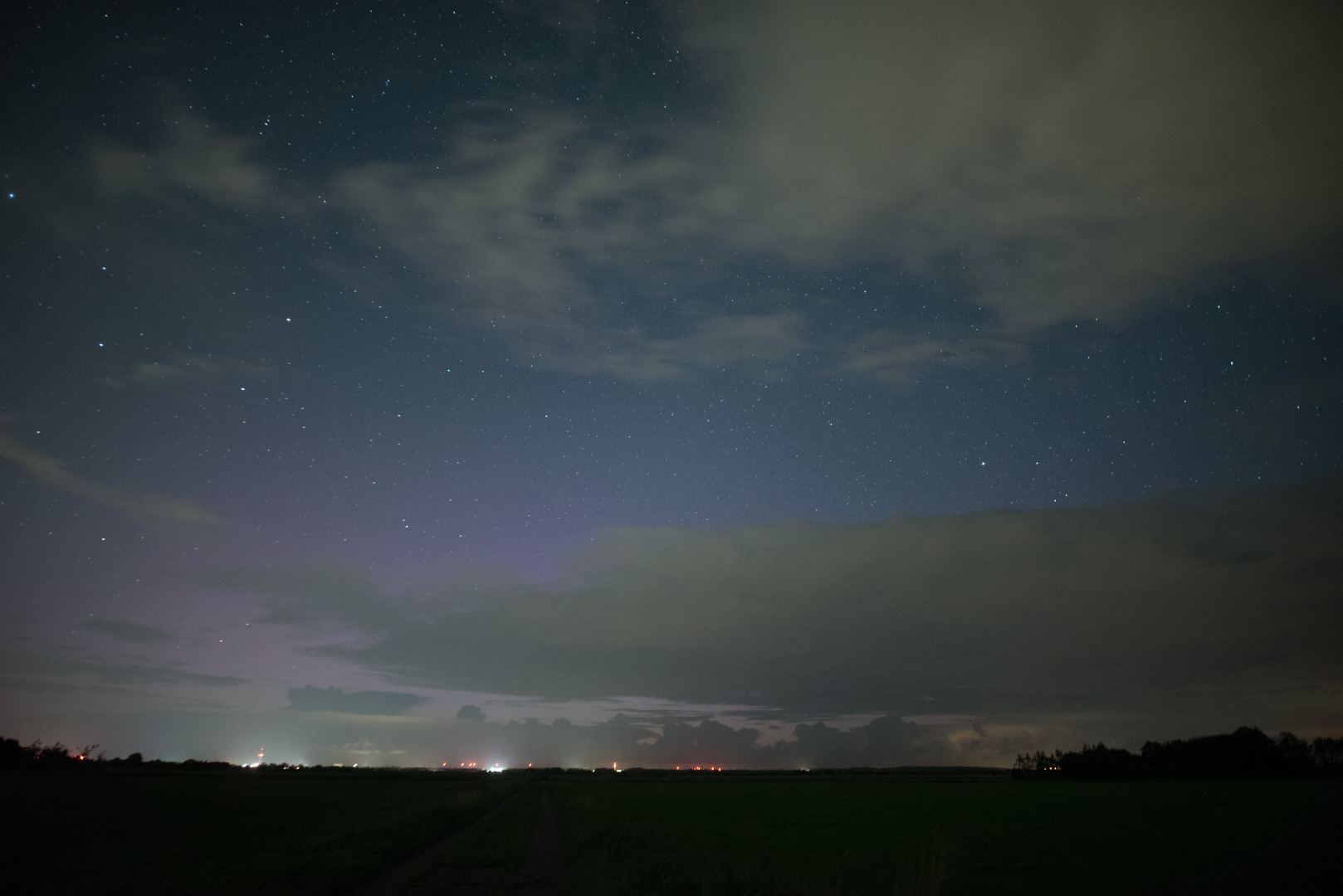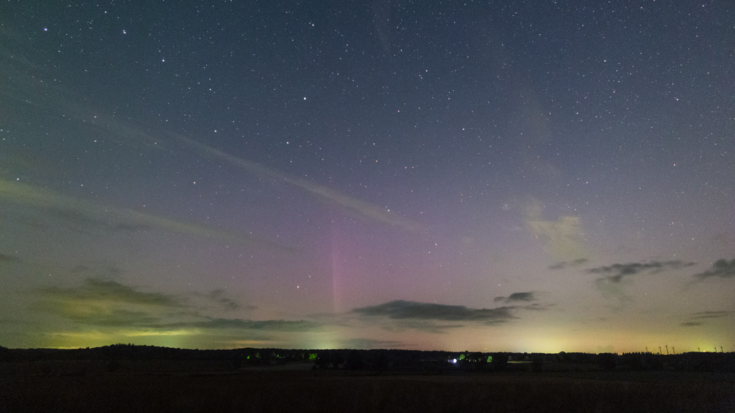 In der Nacht 25.07./26.07.2023 konnte ich ebenfalls Polarlicht in Form einer violetten (fotografischen) flächigen Verfärbung am Nordhorizont beobachten, auf die Schnelle habe ich es mit in den NLC-Faden zu dieser Nacht aufgenommen.