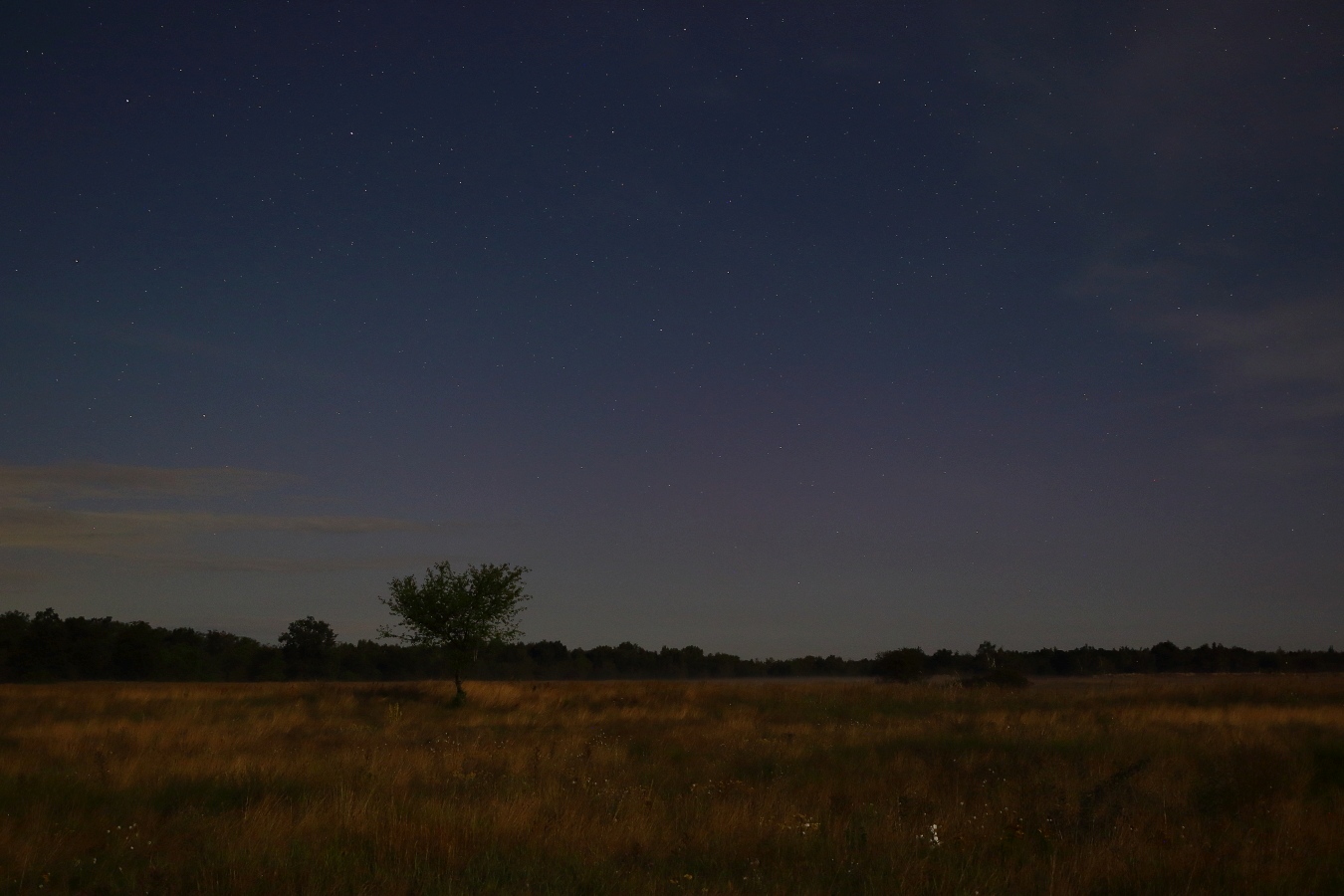 Ich konnte von meinem Standort nördlich von Zerbst (51.99N, 12.10E) in einer vorübergehend größeren Wolkenlücke gen Norden, glücklicherweise genau während einer Aktivitätsphase, ebenfalls Polarlicht nachweisen. Zum Einrichten der Kamera blieb nach hektischem Standortwechsel (das Polarlicht war am alten Standort schon vorher als grüner Bogen und schwach violette Verfärbung fotografisch nachweisbar) leider keine Zeit. Zudem war die Luftfeuchtigkeit am neuen Standort noch höher. Hier hatte ich aufgrund vorheriger Erfahrungen mit mehr Wind gerechnet, wurde allerdings eines Besseren belehrt. Im Nachhinein erwies sich das vermeintliche Manko allerdings als Geschenk. Denn der immer wieder durchziehende Bodennebel sorgte mit dem Mondlicht im Rücken und der sehr speziellen Vegetation, die sowohl an Heide als auch an Moor erinnert, für eine besondere Stimmung. Für's Erste mal 6 Aufnahmen aus diesem Zeitraum: