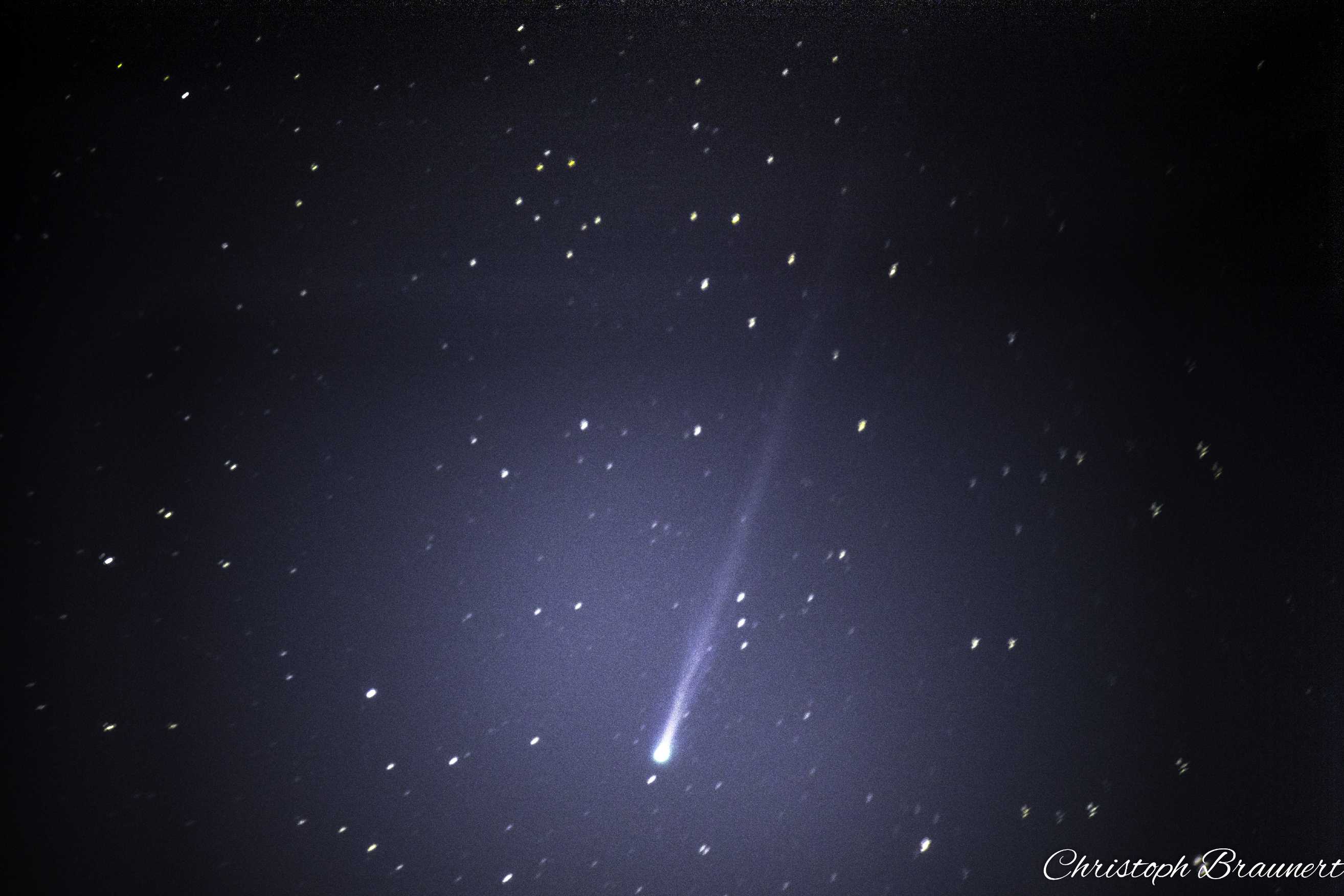 mein obiges Bild war bei 200mm fotografiert, was aber zu weitwinklig war - daher habe ich nur ein 21% großen Ausschnitt gepostet. Ideal sind bei diesem Kometen denke ich 400 bis 1000mm bei Vollformat, je nachdem, was man abbilden möchte: ganzer Schweif oder Details von der Koma und den hellen Schweifbeginn. Im Zweifel lieber kürzer als länger. Der ganze Schweif dürfte derzeit bei 2 bis 3° liegen - Nachweis mit Fotos von heute morgen folgt.