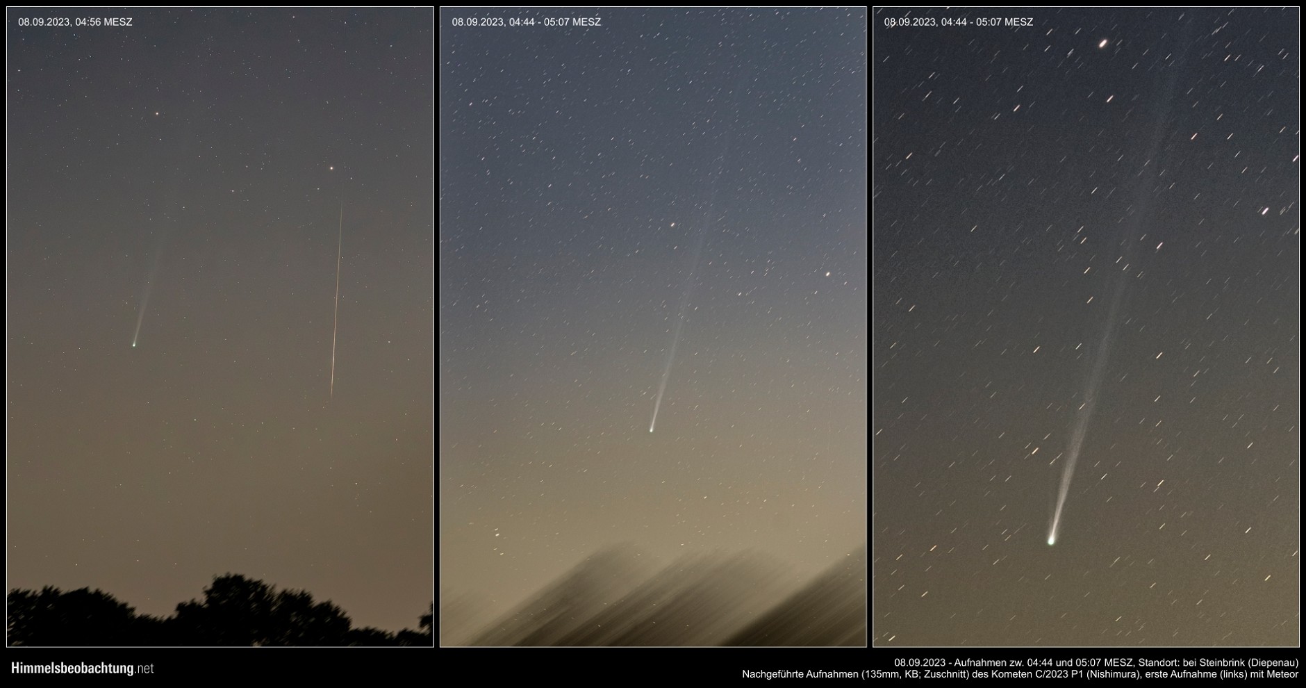 via Skyweek (runterscrollen bis unter die Perseiden) wurde ich gerade auf den neu entdeckten Kometen C/2023 P1 (Nishimura) aufmerksam, der Mitte September vielleicht ein interessantes Beobachtungsobjekt werden könnte. Letzteres kursiv, denn der Schweifstern ist nach derzeitiger Kenntnis ein Kandidat für eine vorzeitige Auflösung (s. https://www.facebook.com/photo/?fbid=700742702067209).