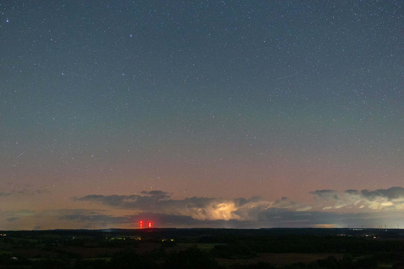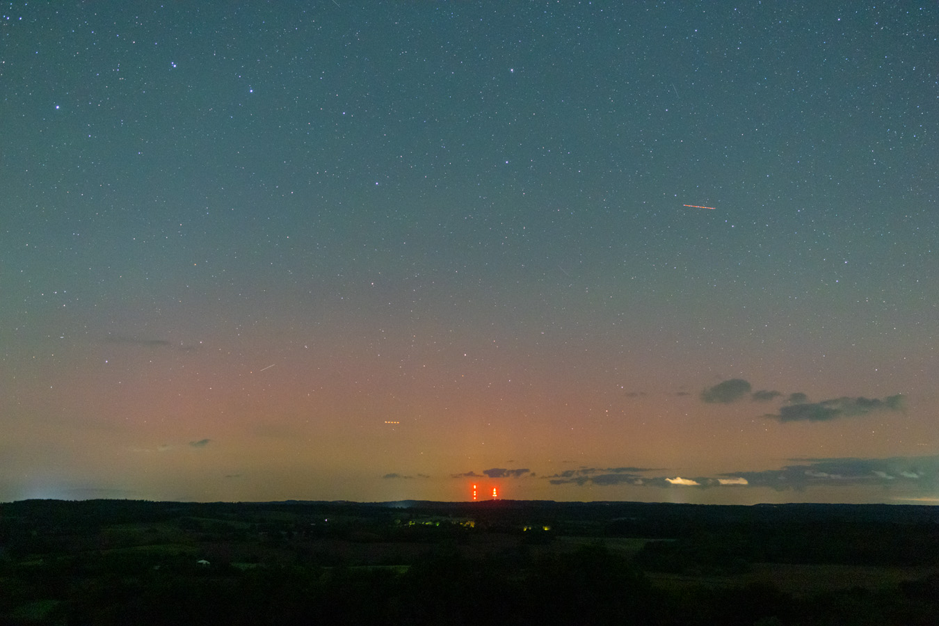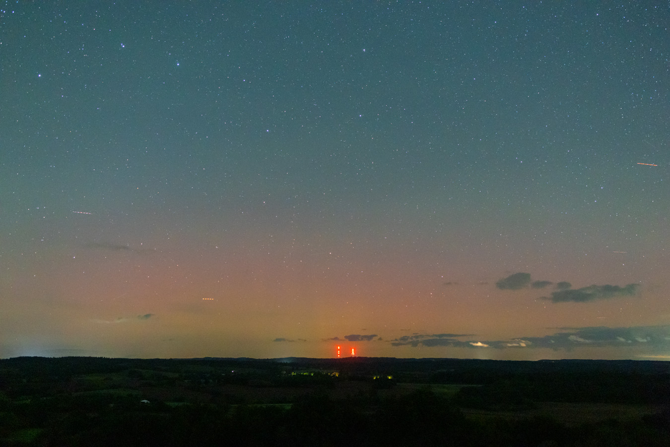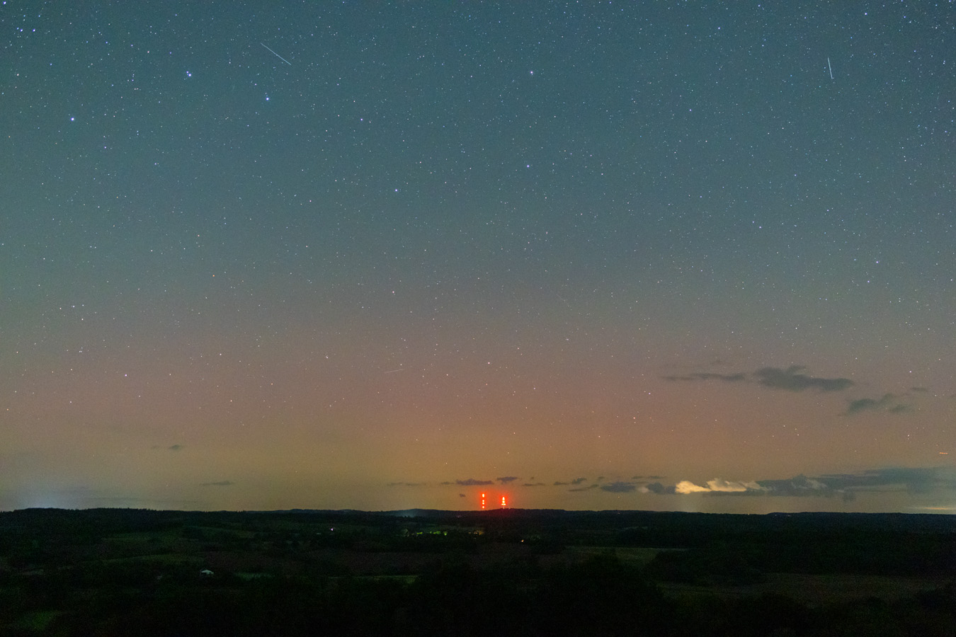 Ich war ab ca. 21:15 am Gömnitzer Turm auf knapp 100 Meter Höhe. Von dort ergibt sich ein wunderbarer Rundumblick. Im Norden liegt der Bungsberg und es gibt in der Richtung nur sehr wenig Lichtverschmutzung. Zunächst zogen von Norden noch einige Wolkenfelder durch, die aber wenig störten und sich später weitgehend auflösten. Die Durchsicht war sehr gut.