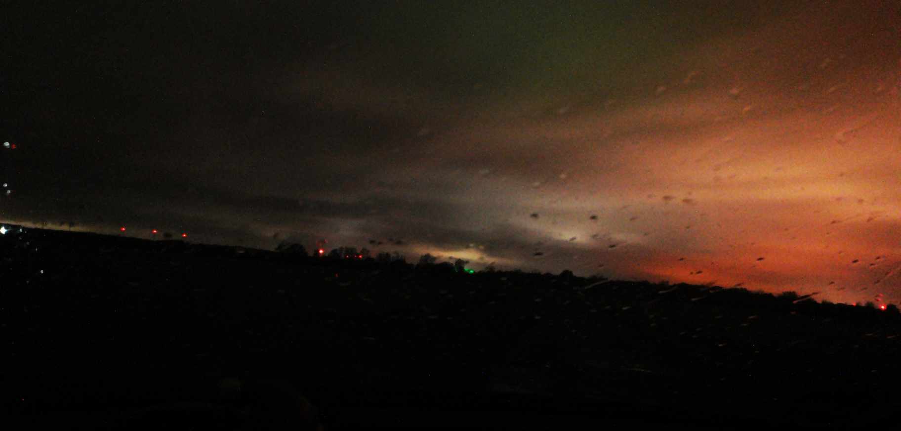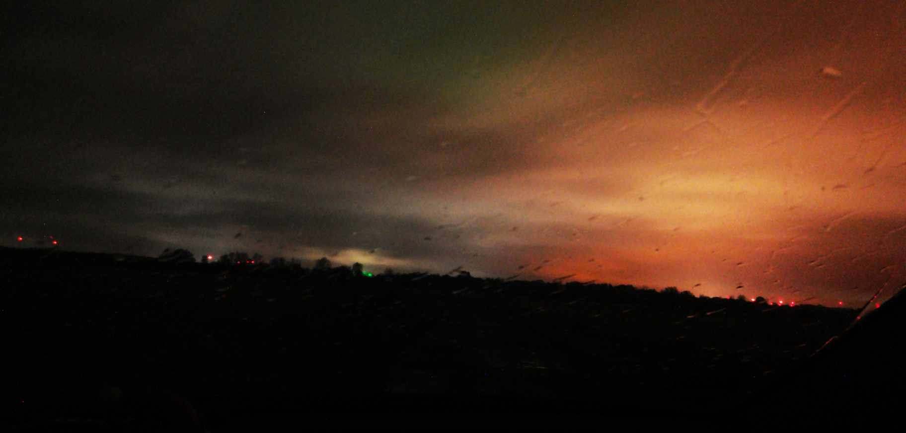 Das Rot ist sicher Lichtverschmutzung von den Windrädern aber den grünen Schimmer kann ich mir nicht erklären.