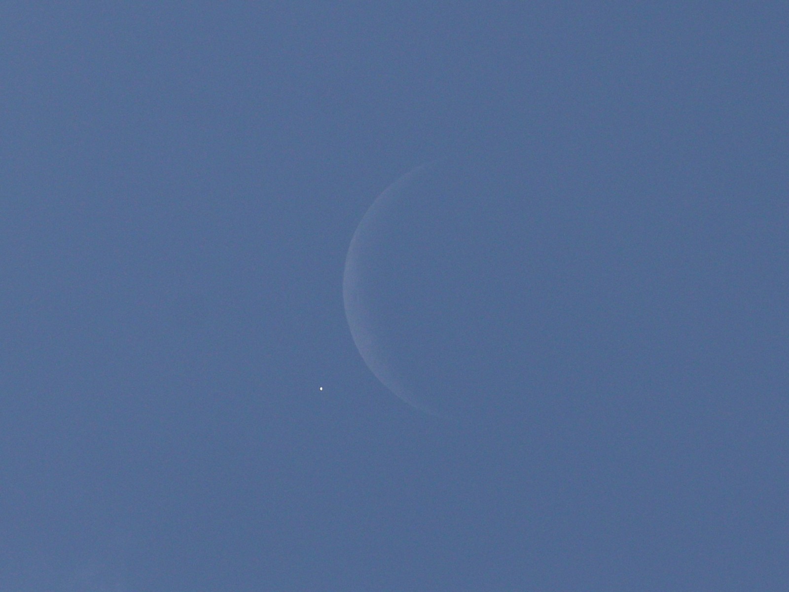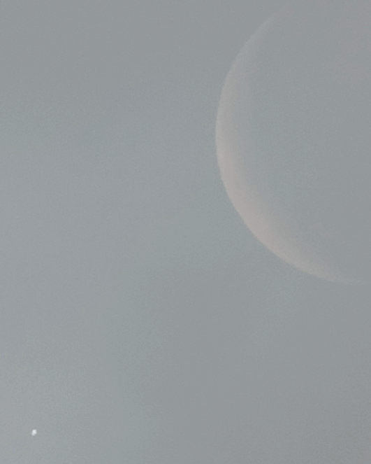 Ein kleiner Nachtrag. Wir hatten bis kurz vor der Bedeckung immer mal wieder einen Blick drauf, aber die Wolken zogen unbarmherzig den Himmel zu. Dennoch hier ein Schnappschuss durch die Dunstschicht mit beiden Objekten im 1000-er Tele.