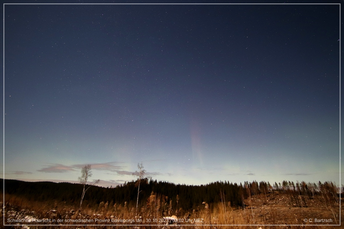in der Zeit von 28.10. bis 11.11. hatte ich einen erholsamen Urlaub in der Gegend Leksand gehabt. Wenn es die Möglichkeit zur Polarlichtsichtung gab, nutze ich sie. Jedoch war meist das Wetter nicht so toll. Daher hatte ich an 3 Nächten die Wolkenlücken gejagd. An zwei von drei Nächten gab es ca.1 Autostunde entfernt meist nur ein kleines Zeitfenster von der Wolkenlücke. Meist reichte das Lückenfenster für 1-2h. Beide davon waren nicht erfolgreich, da es keine Polarlichter gab. Hingegen bei der allerersten Nacht hatte ich Glück gehabt. Nach 2 Autostundenfahrt und kurzer Suche nach einem geeigneten Beobachtungsplatz fand ich diesen in der Provinz Gävleborgs län (ca. N 61,5°.) Das wolkenfreie Fenster hatte ich hier glücklicherweise in der ganzen Nacht von der späten Abenddämmerung bis zum tiefen Morgen gehabt. Trotz fast volle abnehmende Mondphase konnte ich die aktiven Phasen vom Polarlicht gut beobachten. Sowohl das Band als auch die aktiven Beamer konnte ich immer wieder mit bloßem Augen (schwach bis deutlich visuell) verfolgen. Soweit ich es richtig mitbekommen hatte, stammte das schwach angekündigte Polarlicht vom koronalen Loch CH1182.