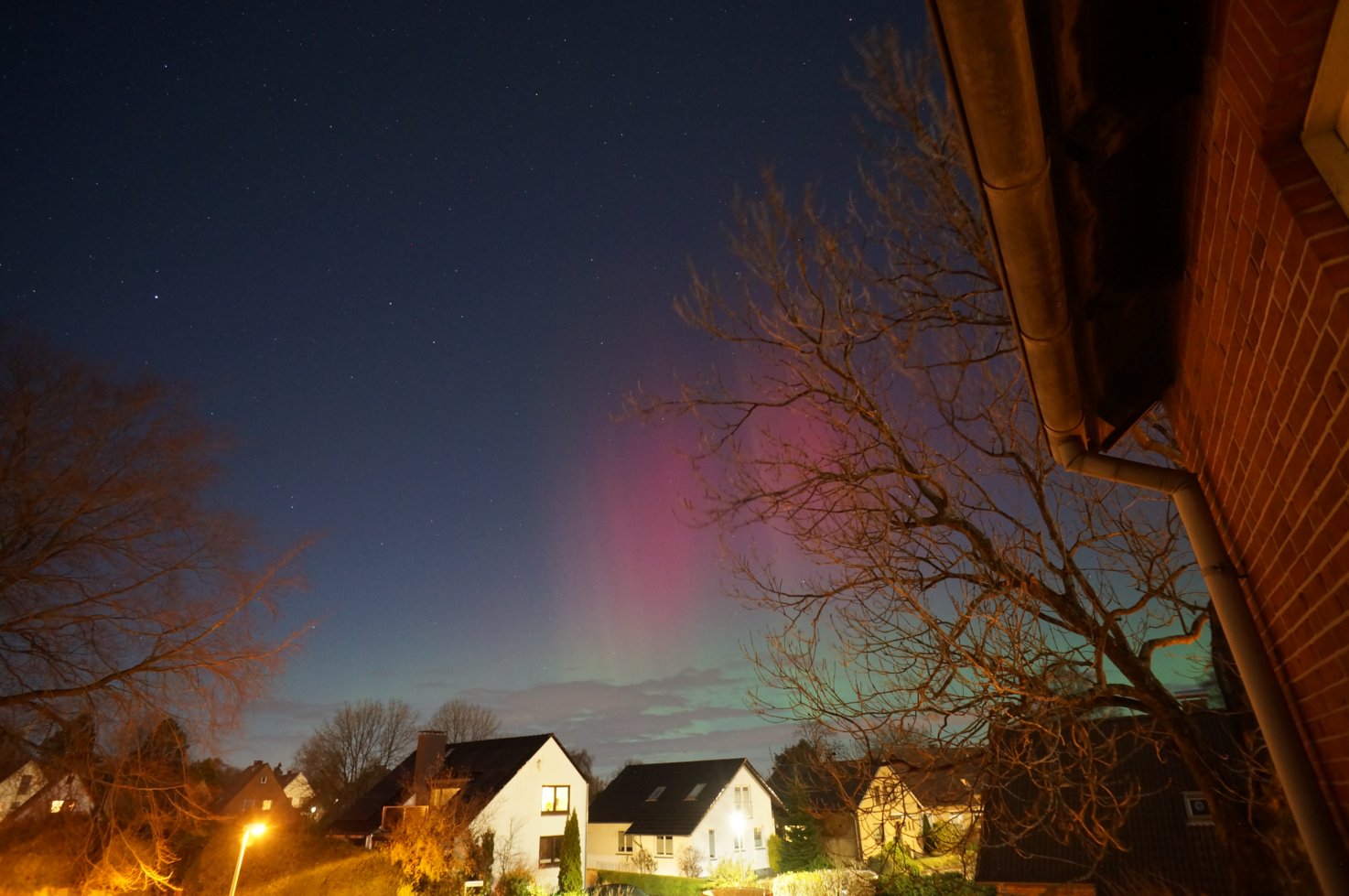 Hallo, auch ich konnte nach vielen verpassten Gelegenheiten endlich mal wieder Polarlicht visuell sehen (teilweise deutlich) und fotografieren. Ein Beispiel hier mit dem auch im Chat erwähnen sichtbaren roten Beamer um 19:15 UTC. Standort bei Henstedt-Ulzburg, Canon R6, 24mm, f2,8, 8/5 sek, ISO 3200.