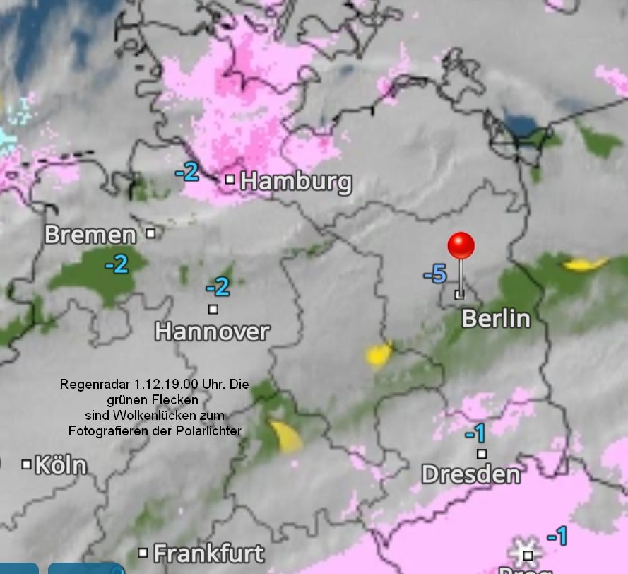 Als Hintergrung noch einmal ein Bild des Regenradarbildes vom 01.12.2023 gegen 19:00 Uhr. Das Bild zeigt, wie wenig doch an Wolkenlücken da waren. Da hat sich doch die Anfahrt gelohnt.