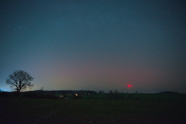 Ich konnte in dem von Thorsten Witt genannten Zeitraum (01:21 - 01:26 MEZ) westlich von Gölsdorf (51.95N, 12.95E) ebenfalls ein gaaaaanz schwaches fotografisches Polarlicht in Form eines horizontnahen rötlichen Glimmens nachweisen, das bei schlechter Transparenz hinter Dunst allerdings nur im Vergleich von Folgeaufnahmen nachvollziehbar ist. Ich will nicht verschweigen, dass ich mir mehr erhofft hatte als diese homöopathischen Dosen. Über dem Hauch von Polarlicht zeigte sich als kleine Entschädigung Airglow. Das Highlight dieser langen Nacht, die ersten wärmenden Züge zurück verkehren am Wochenende erst kurz vor 6 Uhr, war aber sicher ein anderes. Nämlich ein Trupp zurückkehrender Kraniche, die, was sehr unüblich ist, (erst) mitten in der Nacht ihr Quartier in unmittelbarer Nähe bezogen und anschließend so gar nicht zur Ruhe kommen wollten. Zur Ruhe kommen und wollte ich bei Temperaturen am Gefrierpunkt allerdings auch nicht...