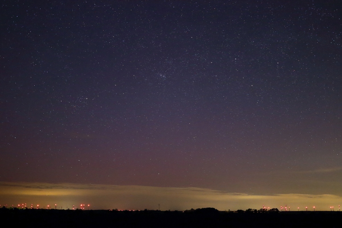 Ich dachte bis zur Dämmerung aufgrund dichter Wolken erst gar nicht an eine mögliche Beobachtung, es riss dann aber unerwartet auf, sodass ich dann doch mal meine Sachen packte und ins Feld ging. Leider zogen aber dennoch hohe Wolkenfelder durch und Lichtverschmutzung gab noch ihren Rest dazu. Trotzdem konnte ich was fotografisch nachweisen: Später noch von einem anderen Standpunkt, um zumindest die Lichtverschmutzung etwas zu reduzieren: Danach nahm dann die Aktivität ab. Den neuen Substurm kurz nach 2 Uhr MESZ hatte ich zwar mitbekommen, da konnte ich aber nichts nachweisen, das Mondlicht war wohl doch zu hell, bzw. das Polarlicht zu schwach.