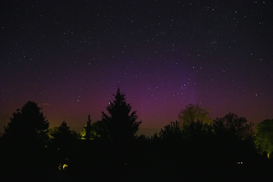 Die Werte waren vielversprechend. Doch ich hatte im letzten Jahr schon Besseres gesehen. Immerhin verzogen sich die Wolken noch rechtzeitig, um ein schwaches diffuses Leuchten am Nordhimmel visuell wahrzunehmen. Fotografisch zeigte sich ein violettes Licht hinter den Wolken.