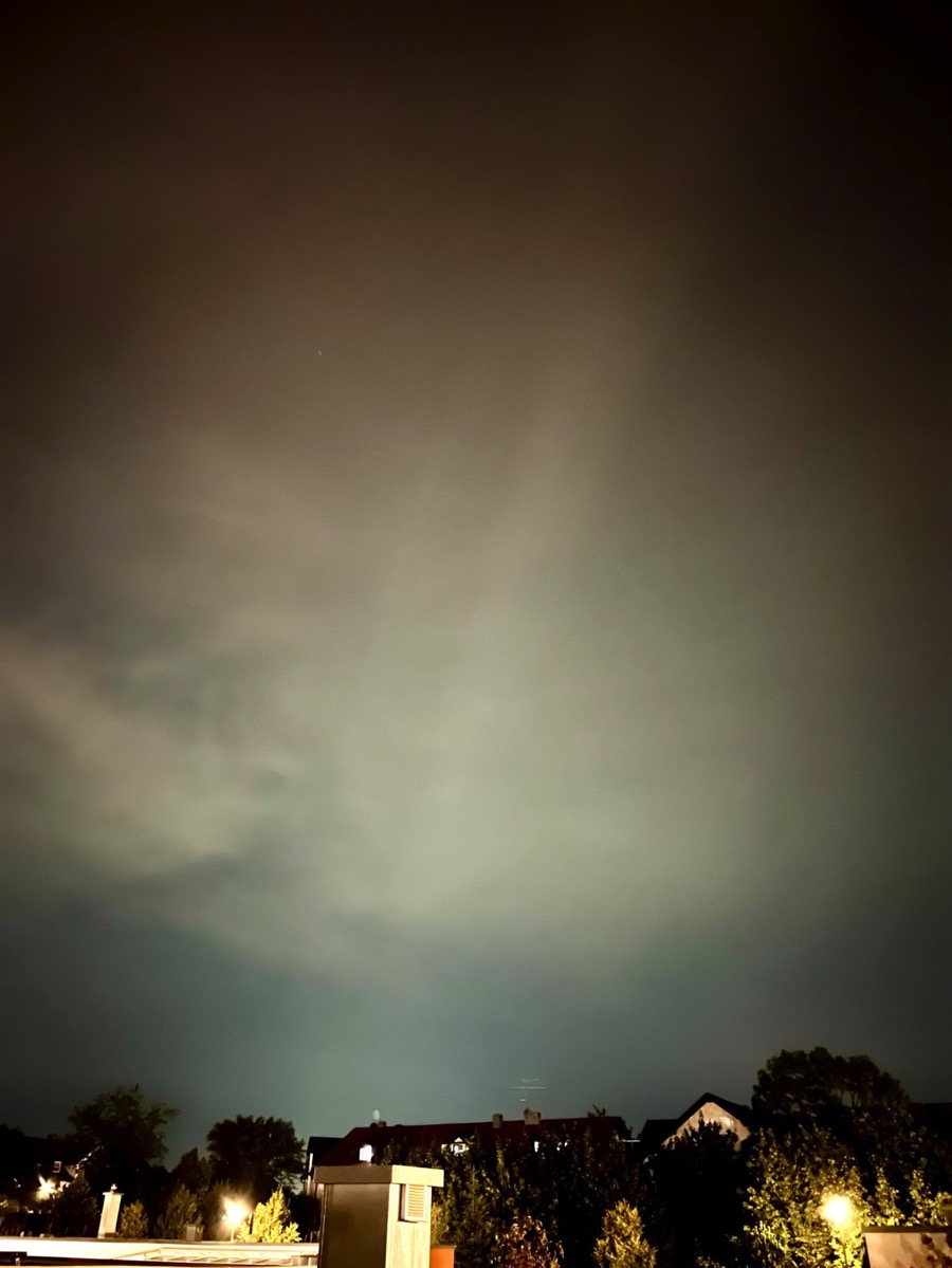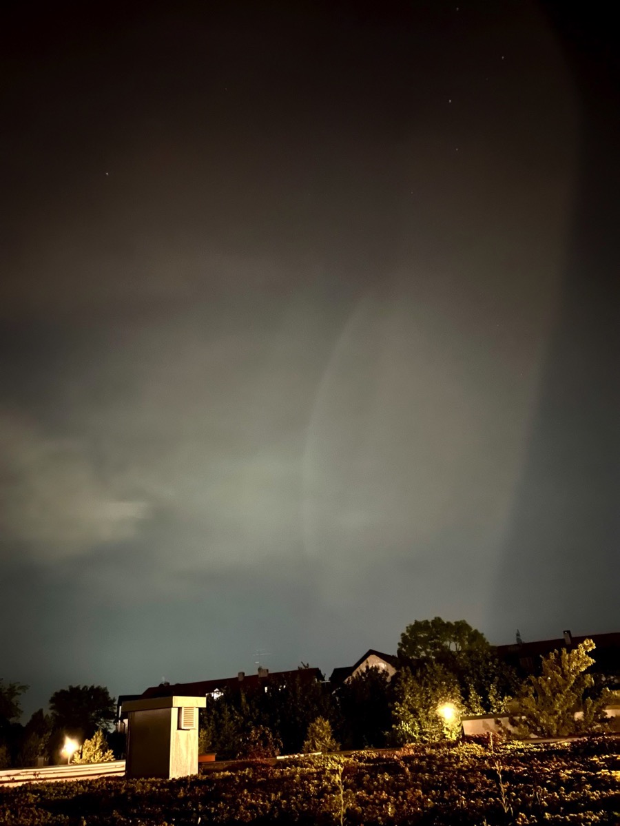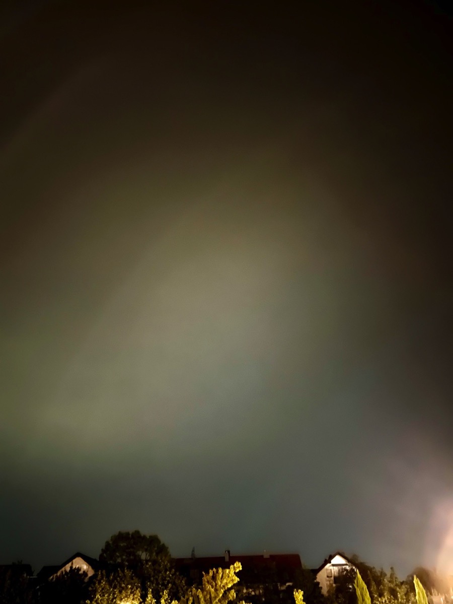 Hier in Südhessen waren zumindest die Polarlichter von der Nacht vom 12. auf den 13.08 durchaus gut bis sehr gut im Nordhorizont in den Handyfotos sichtbar. Mein iphone produziert mir der normalen Linse (1x) bei 10 Sekunden Belichtungszeit die besten Ergebnisse. Es hilft dabei direkte Lichtquellen mit Bäumen oder anderen Gegenständen wegzublocken, damit das Bild nicht so viele Helligkeitsunterschiede hat und die Lichtreflexe in der Handylinse vermieden werden.