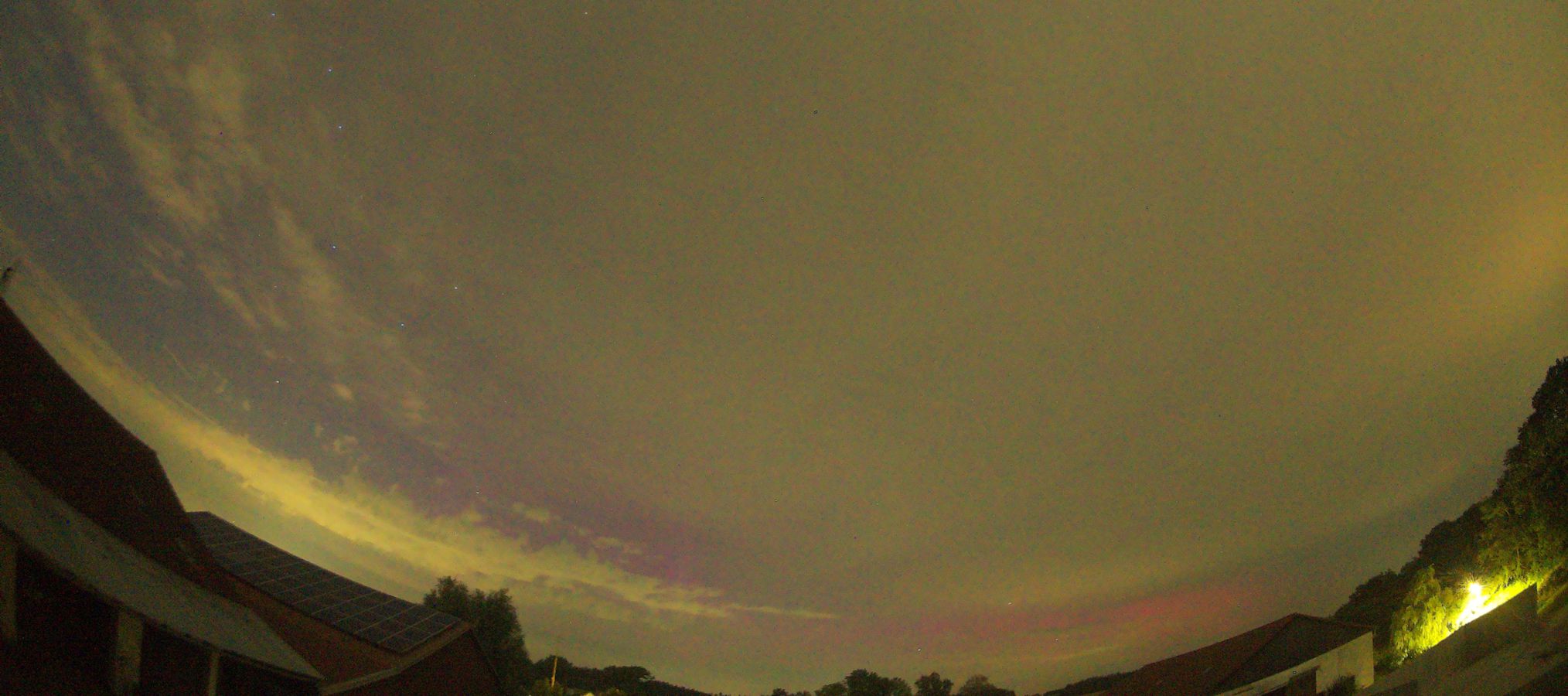 Einzig das Violett links im Bild IMG_8390 (über der Straßenleuchte) könnte durch Polarlicht verursacht worden sein, allerdings aufgrund der sehr ähnlichen Artefakte in den anderen Bildern nur mit geringer Wahrscheinlichkeit.
