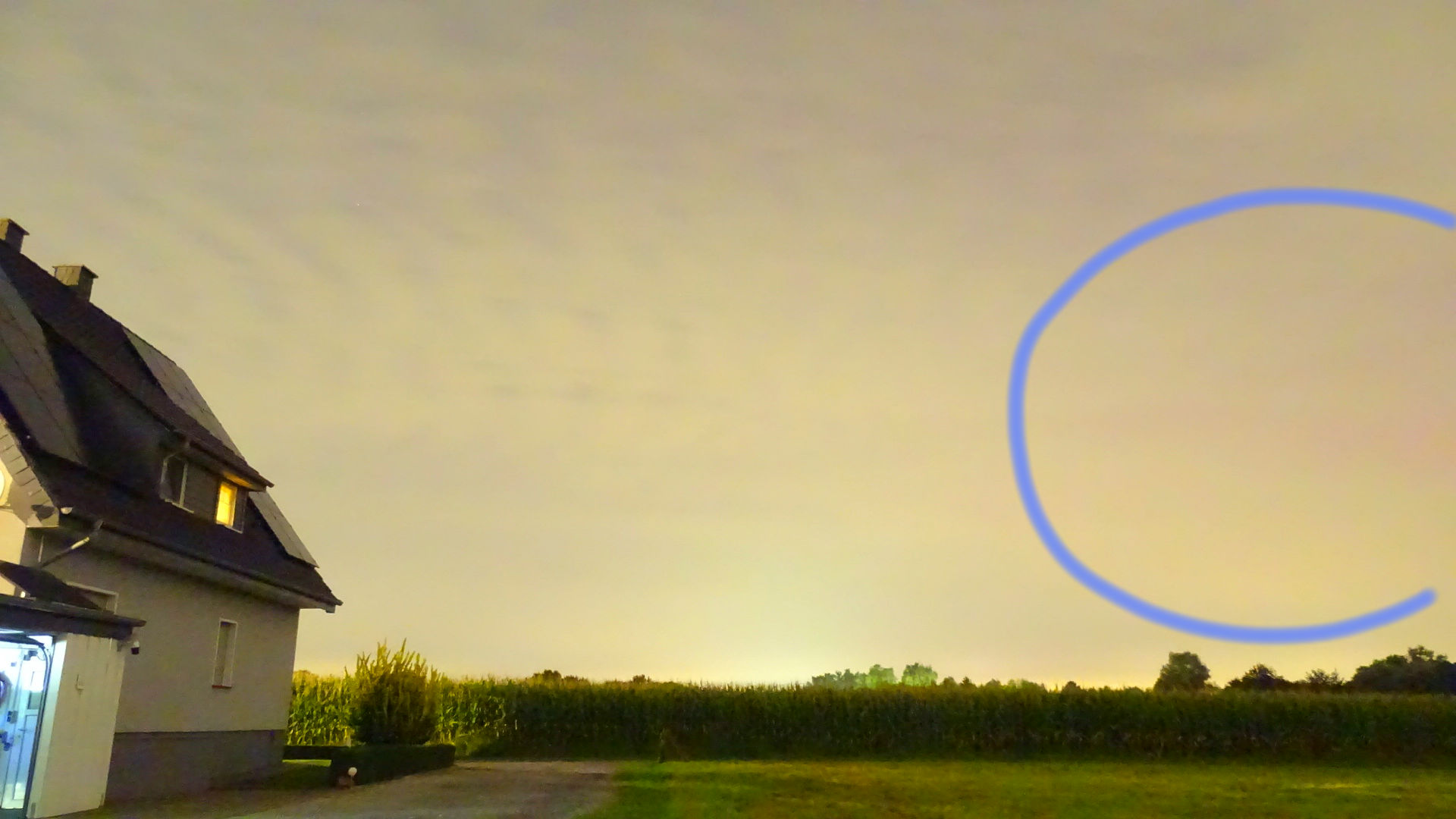 Als ich an meinen Beobachtungsort ankam, konnte ich trotz sehr starker Lichtstreuung aufgrund von Dunst und hoher Wolkenfelder Polarlicht nachweisen. Grenzte bei den Bedingungen schon an ein Wunder, aber gut, Nachweis ist Nachweis. Meist handelte es sich nur um Glimmen, konnte aber wohl auch Strahlen festhalten. Hier ein Bild, wo das Polarlicht am deutlichsten war: