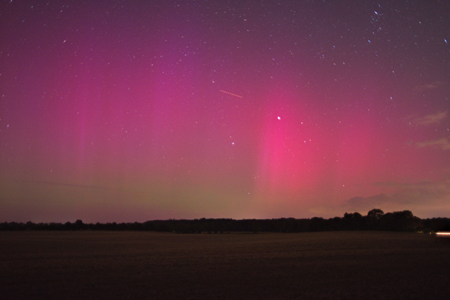 Habe eben in Kaltenkirchen (53°50′N 9°57′E) zeitweise sogar mit bloßem Auge deutlich rötliches Polarlicht sehen können.