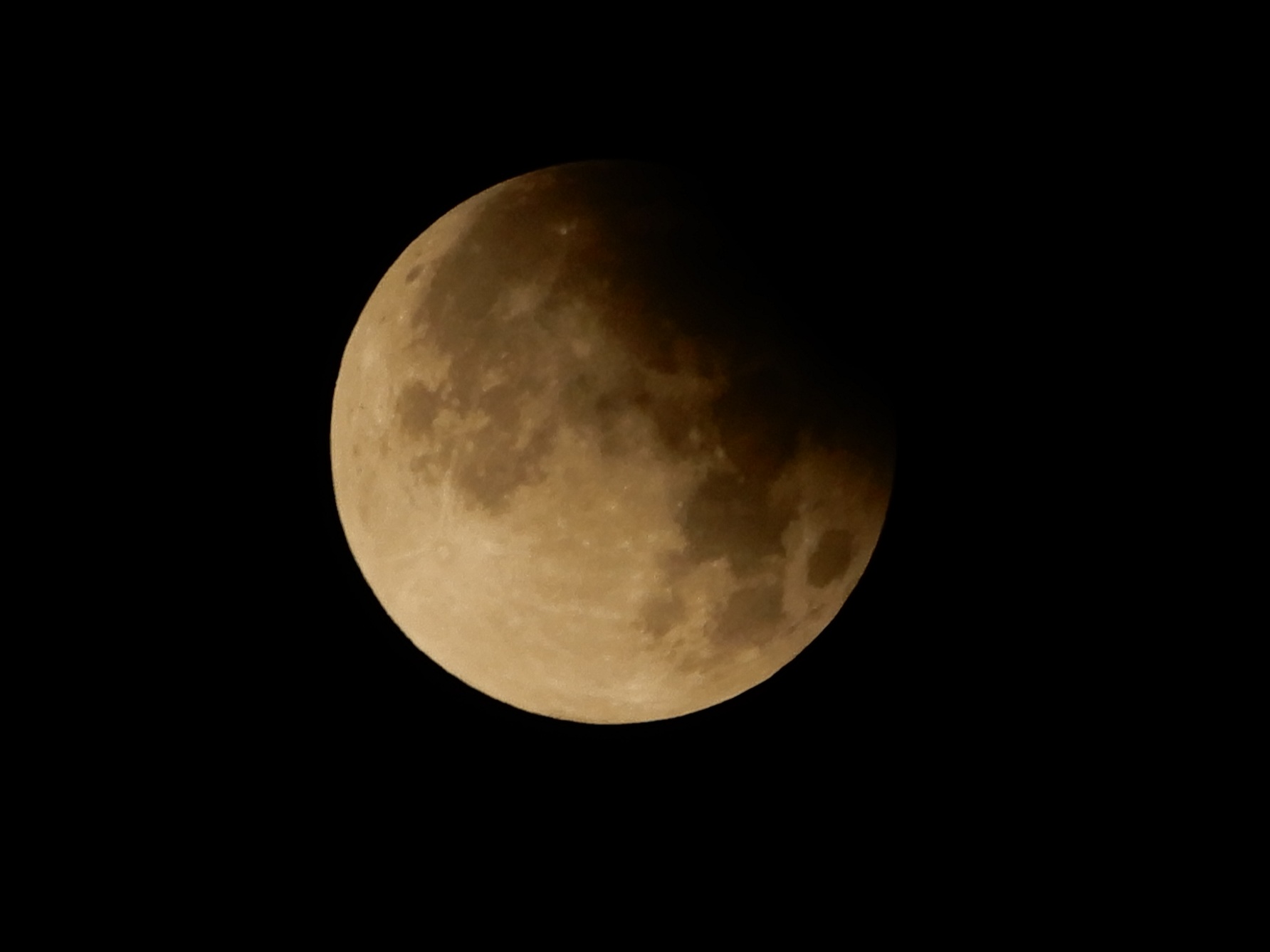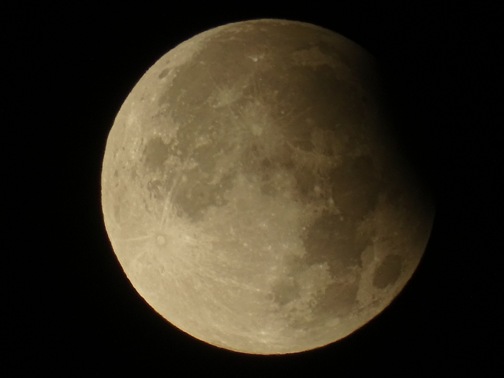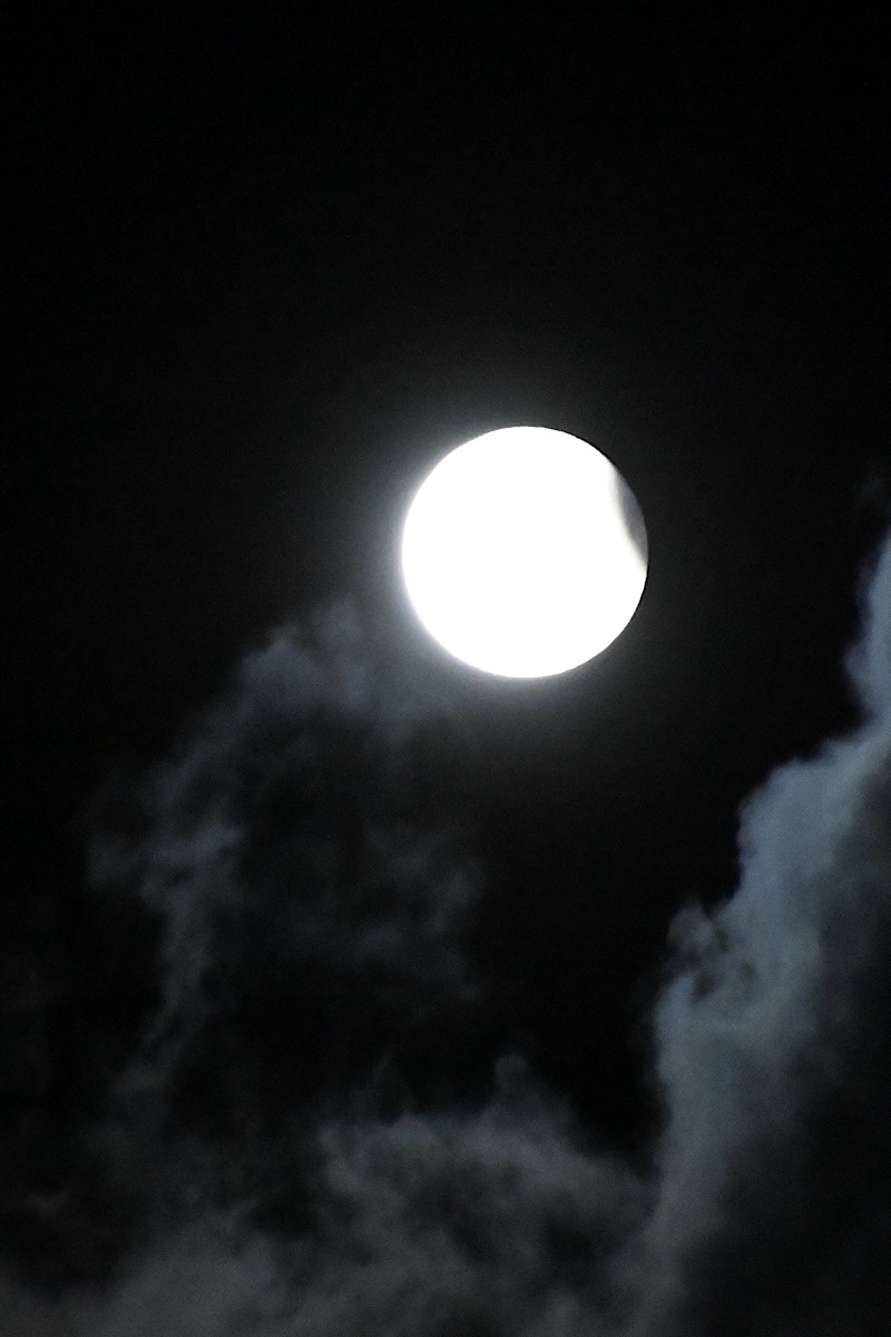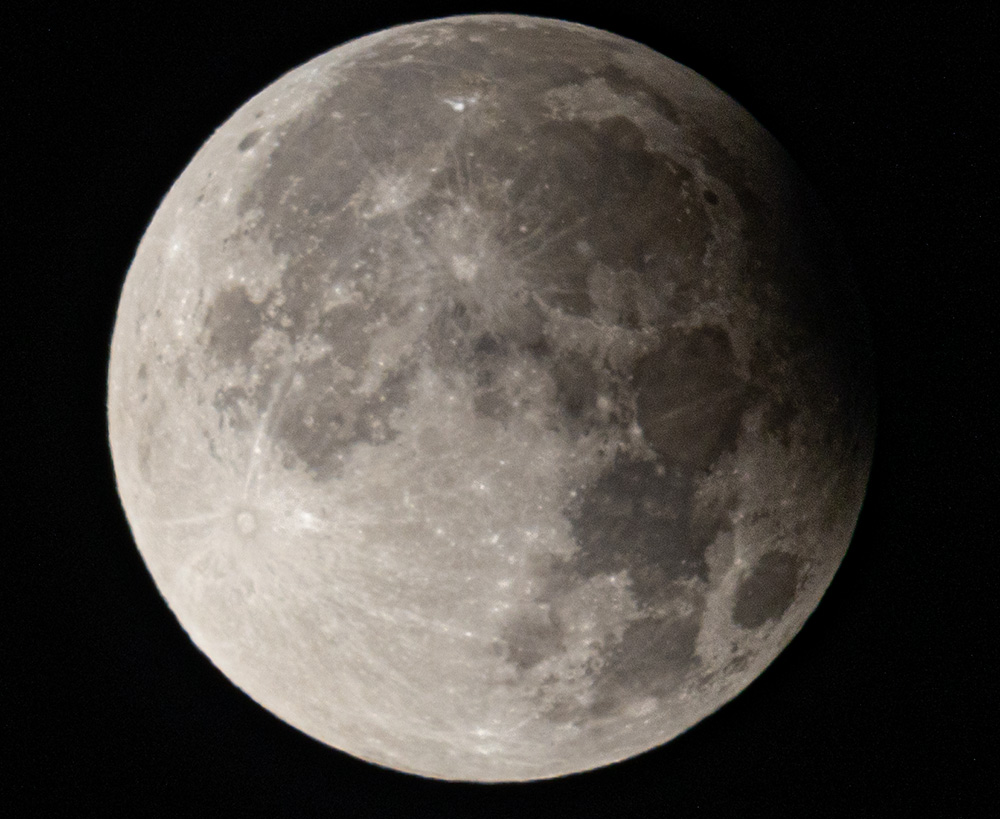 Den Halbschatten bemerkte ich visuell erst nach 40 min in der 92 Minuten langen ersten Finsternisphase; da war die Mondhelligkeit integral erst um +0,15 mag (-13%) gegenüber dem Vollmond abgeschwächt.