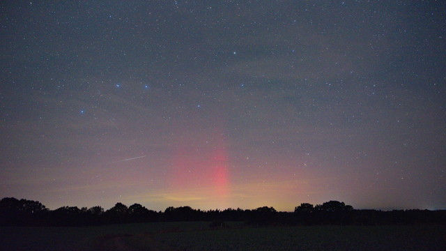 Kommentar: Gegen 00:30 MESZ hat meine Kamera diese Aurora aufgenommen (sie hielt keine 5 Minuten an), erkennen konnte ich zu keiner Zeit etwas. Später, gegen 02:37 tauchten weitere, nicht sichtbare rötliche Beamer auf für ein paar wenige Minuten. Größtenteils war es sternenklar.