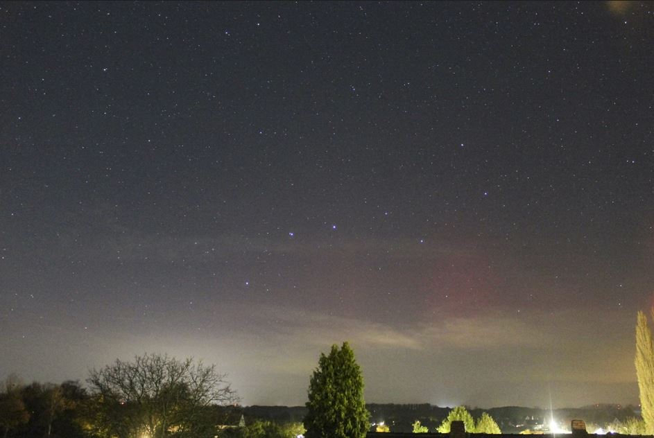 In Büdelsdorf schwaches fotografisches Polarlicht, rotes Leuchten, aufgenommen mit Annke-Cam I81EM (neue WebCam), teilweise Kontrast- und farbverstärkt (IrfanView)