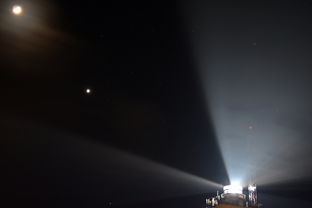 Das erste mit Mond und Venus entstand um 17:55 Uhr Um Mond, Venus und Saturn auf ein Bild zu bannen, störte ein wenig unser Leuchtturm.