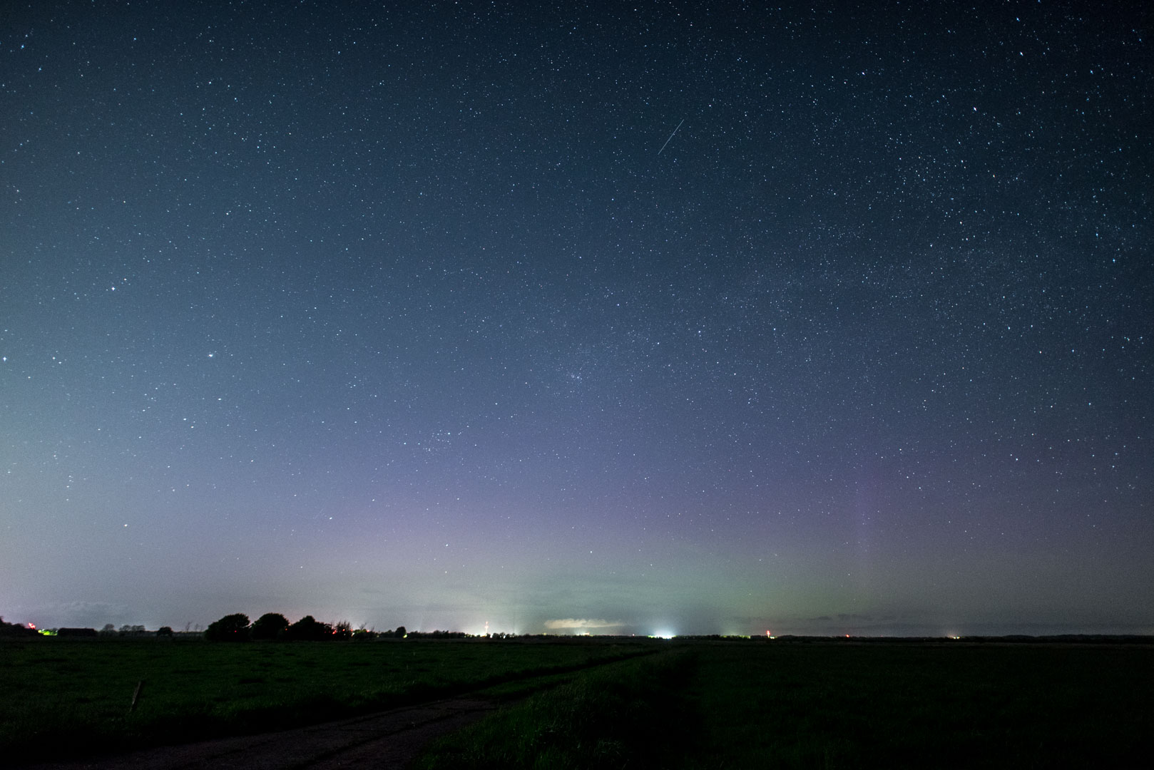 bei Lübbecke (ca. 52.3°N) war die Nacht überwiegend bewölkt. Dennoch zeigte sich abschnittsweise der Sternenhimmel, samt fotografisch nachweisbarem Polarlicht:
