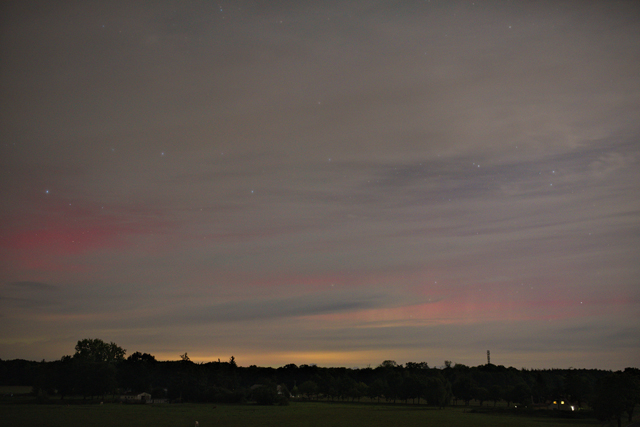 Gegen 01:30 MESZ trat fotografisches rötliches Polarlicht mit schwachen Beamern auf mit etwa 5 Minuten Dauer.