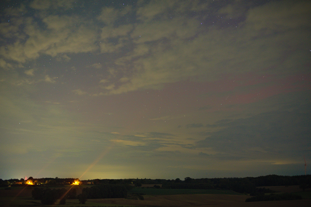 Kommentar: Bei relativ starker Bewölkung konnte ich von 20:50 bis 23:00 Uhr MESZ durchgehend Nordlicht ablichten, zwischen circa 21:45 und 23:00 Uhr war das Polarlicht schwach visuell sichtbar mit einem leichten Grünton im Polarlichtbogen. Die Aufnahmen entstanden nahe Poggensee/Bad Oldesloe.
