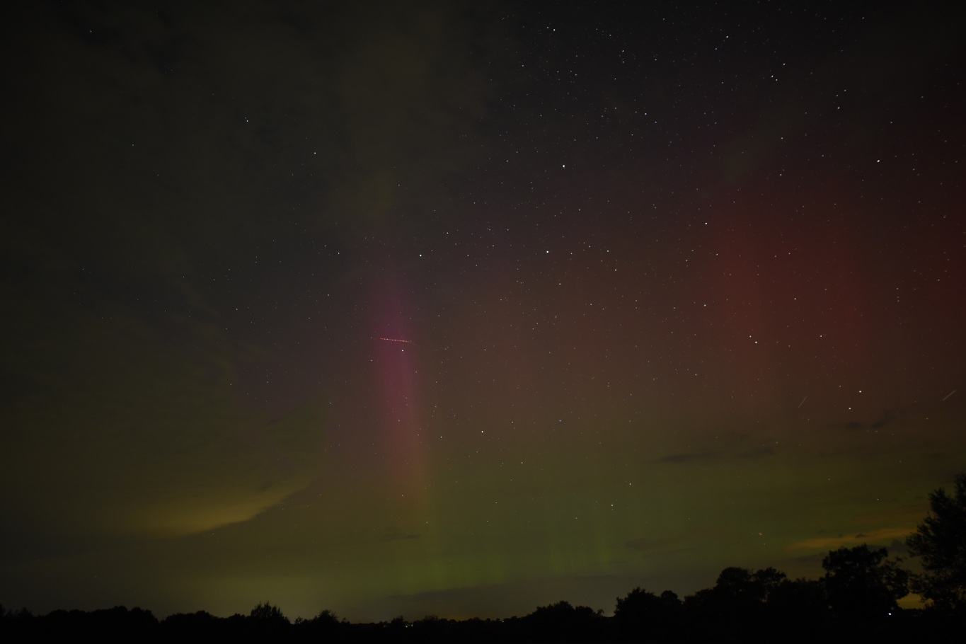 anbei noch meine Beobachtung von der Nacht. Positioniert hatte ich mich auf einem Feldweg östlich von Rellingen, was nordwestlich von Hamburg liegt. Dort konnte ich bereits bei Ankunft gleich Polarlicht nachweisen: Kurz danach wurde der Rotanteil etwas mehr und der grüne Bogen deutlich visuell. Die Strahlen waren zeitweise schwach visuell zusehen. Danach nahm die Strahlenaktivität wieder ab, der grüne Bogen flackerte aber nochmals auf: Im Anschluss glimmte es nur noch und kurz nach 0 Uhr brach ich dann ab.