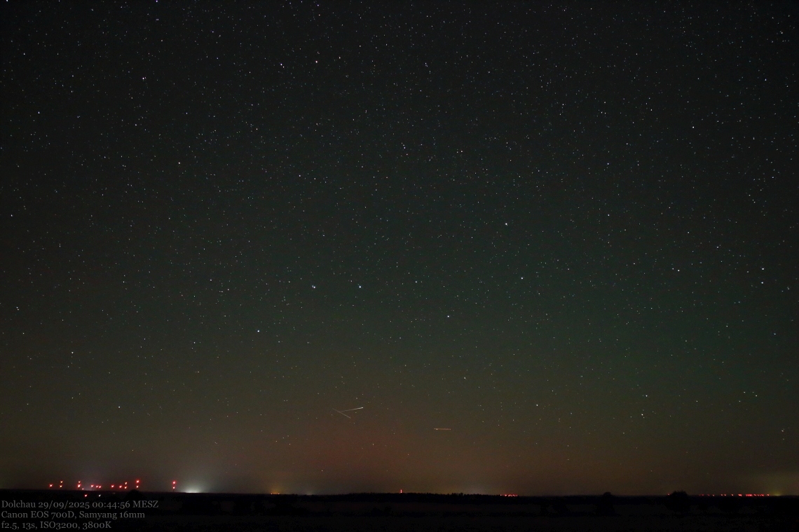 Zur Vervollständigung (von dann 6 Polarlicht-Nächten in Folge im D-A-CH - Gebiet): Auch diese Nacht war kurzzeitig ein schwaches fotografisches Polarlicht in Form eines roten Glühens nachweisbar. Bei der rötlichen Aufhellung, die auf den Panomax-Cams auf Amrum ( https://amrum.panomax.com/nebel?t=2025- ... 131&tl=133 / https://amrum.panomax.com/nebel?t=2025- ... 131&tl=133 ) & Rügen ( https://kap-arkona.panomax.com/peilturm ... z=100&tl=0 / https://kap-arkona.panomax.com/peilturm ... z=100&tl=0 ) auf den Frames von 00:40 & 00:50 MESZ zu sehen war, handelte es sich um Polarlicht. Nachweisen ließ sich dieses trotz suboptimaler Bedingungen hinter Dunst auch von meinem Standort mitten in der Altmark. Hier eine 5er-Serie mit dem "Peak" gegen 00:44 MESZ: